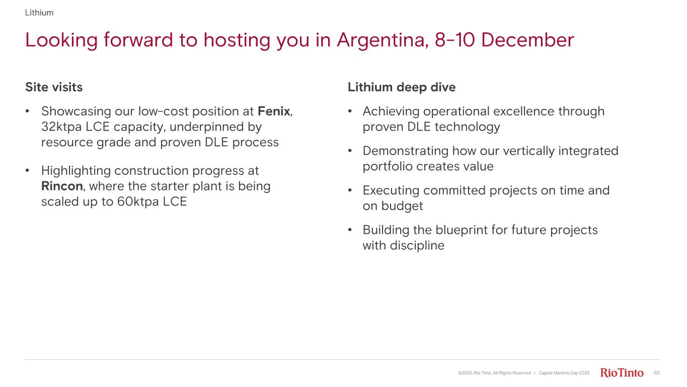 Looking forward to hosting you in Argentina, 8 - 10 December ©2025, Rio Tinto, All Rights Reserved | Capital Markets Day 2025 62 Lithium deep dive • Achieving operational excellence through proven DLE technology • Demonstrating how our vertically integrated portfolio creates value • Executing committed projects on time and on budget • Building the blueprint for future projects with discipline Site visits • Showcasing our low - cost position at Fenix , 32ktpa LCE capacity, underpinned by resource grade and proven DLE process • Highlighting construction progress at Rincon , where the starter plant is being scaled up to 60ktpa LCE Lithium