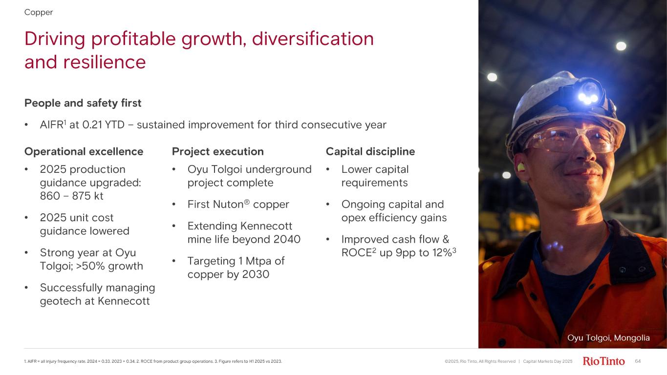 Driving profitable growth, diversification and resilience ©2025, Rio Tinto, All Rights Reserved | Capital Markets Day 2025 641. AIFR = all injury frequency rate. 2024 = 0.33. 2023 = 0.34. 2. ROCE from product group operations. 3. Figure refers to H1 202 5 vs 2023. Operational excellence Project execution Capital discipline • 2025 production guidance upgraded: 860 – 875 kt • 2025 unit cost guidance lowered • Strong year at Oyu Tolgoi; >50% growth • Successfully managing geotech at Kennecott • Oyu Tolgoi underground project complete • First Nuton ® copper • Extending Kennecott mine life beyond 2040 • Targeting 1 Mtpa of copper by 2030 • Lower capital requirements • Ongoing capital and opex efficiency gains • Improved cash flow & ROCE 2 up 9pp to 12% 3 People and safety first • AIFR 1 at 0.21 YTD – sustained improvement for third consecutive year Copper Oyu Tolgoi, Mongolia