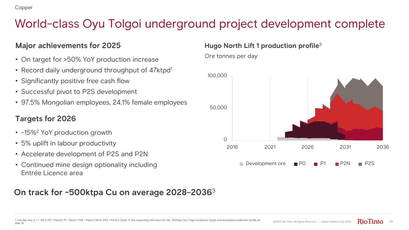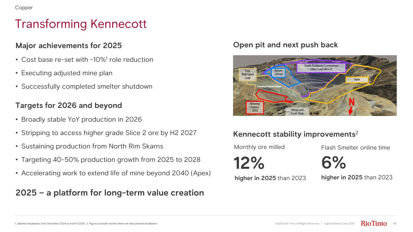 World - class Oyu Tolgoi underground project development complete ©2025, Rio Tinto, All Rights Reserved | Capital Markets Day 2025 65 1. One day only. 2. +/ - 5% 3. P0 = Panel 0, P1 = Panel 1, P2N = Panel 2 North, P2S = Panel 2 South. 3. See supporting references for the ~500ktpa Oyu Tolgoi production target and associated production profile on slide 78. Major achievements for 2025 • On target for >50% YoY production increase • Record daily underground throughput of 47ktpd 1 • Significantly positive free cash flow • Successful pivot to P2S development • 97.5% Mongolian employees, 24.1% female employees Targets for 2026 • ~15%2 YoY production growth • 5% uplift in labour productivity • Accelerate development of P2S and P2N • Continued mine design optionality including Entrée Licence area Copper Hugo North Lift 1 production profile 3 Ore tonnes per day On track for ~500ktpa Cu on average 2028 - 2036 3 0 50,000 100,000 2016 2021 2026 2031 2036 Development ore P0 P1 P2N P2S