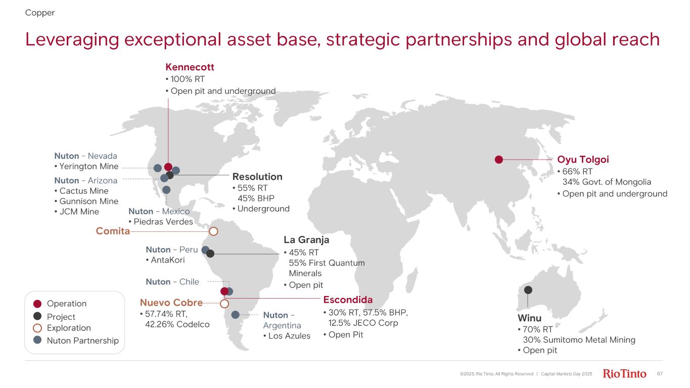 Leveraging exceptional asset base, strategic partnerships and global reach ©2025, Rio Tinto, All Rights Reserved | Capital Markets Day 2025 67 Copper Nuevo Cobre • 57.74% RT, 42.26% Codelco Comita Resolution • 55% RT 45% BHP • Underground Kennecott • 100% RT • Open pit and underground La Granja • 45% RT 55% First Quantum Minerals • Open pit Nuton - Peru • AntaKori Nuton - Chile Nuton - Argentina • Los Azules Nuton - Arizona • Cactus Mine • Gunnison Mine • JCM Mine Nuton - Nevada • Yerington Mine Nuton - Mexico • Piedras Verdes Escondida • 30% RT, 57.5% BHP , 12.5% JECO Corp • Open Pit Oyu Tolgoi • 66% RT 34% Govt. of Mongolia • Open pit and underground Winu • 70% RT 30% Sumitomo Metal Mining • Open pit Operation Project Exploration Nuton Partnership
