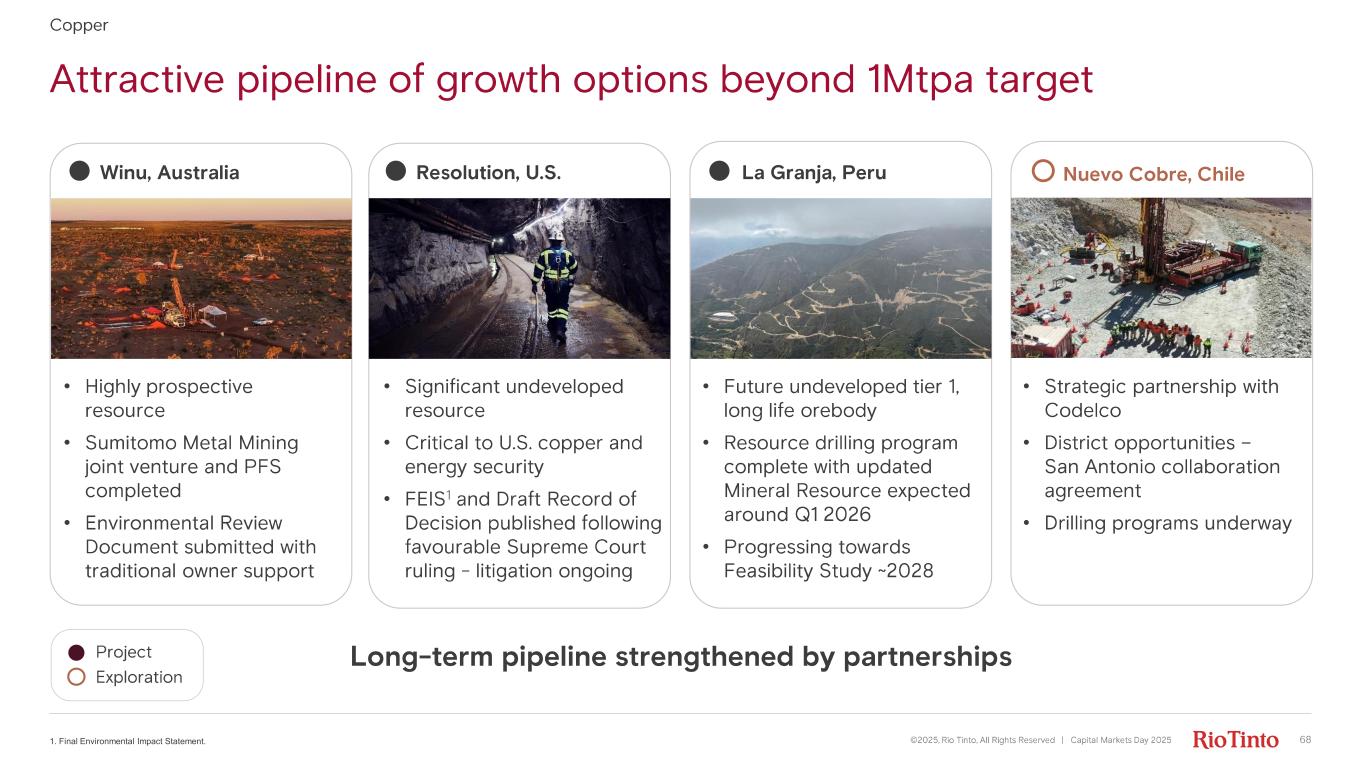 • Highly prospective resource • Sumitomo Metal Mining joint venture and PFS completed • Environmental Review Document submitted with traditional owner support Attractive pipeline of growth options beyond 1Mtpa target ©2025, Rio Tinto, All Rights Reserved | Capital Markets Day 2025 681. Final Environmental Impact Statement. Copper • Significant undeveloped resource • Critical to U.S. copper and energy security • FEIS 1 and Draft Record of Decision published following favourable Supreme Court ruling - litigation ongoing • Future undeveloped tier 1, long life orebody • Resource drilling program complete with updated Mineral Resource expected around Q1 2026 • Progressing towards Feasibility Study ~2028 • Strategic partnership with Codelco • District opportunities – San Antonio collaboration agreement • Drilling programs underway Long - term pipeline strengthened by partnerships Nuevo Cobre, Chile La Granja, PeruResolution, U.S. Project Exploration Winu , Australia