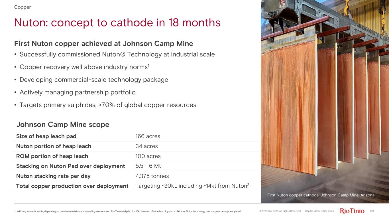 Nuton: concept to cathode in 18 months ©2025, Rio Tinto, All Rights Reserved | Capital Markets Day 2025 691. Will vary from site to site, depending on ore characteristics and operating environment. Rio Tinto analysis. 2. ~16kt from run of mine leaching and ~14kt from Nuton technology over a 4-year deployment period. First Nuton copper achieved at Johnson Camp Mine • Successfully commissioned Nuton® Technology at industrial scale • Copper recovery well above industry norms 1 • Developing commercial - scale technology package • Actively managing partnership portfolio • Targets primary sulphides, >70% of global copper resources Copper Size of heap leach pad 166 acres Nuton portion of heap leach 34 acres ROM portion of heap leach 100 acres Stacking on Nuton Pad over deployment 5.5 - 6 Mt Nuton stacking rate per day 4,375 tonnes Total copper production over deployment Targeting ~30kt, including ~14kt from Nuton 2 Johnson Camp Mine scope First Nuton copper cathode, Johnson Camp Mine, Arizona