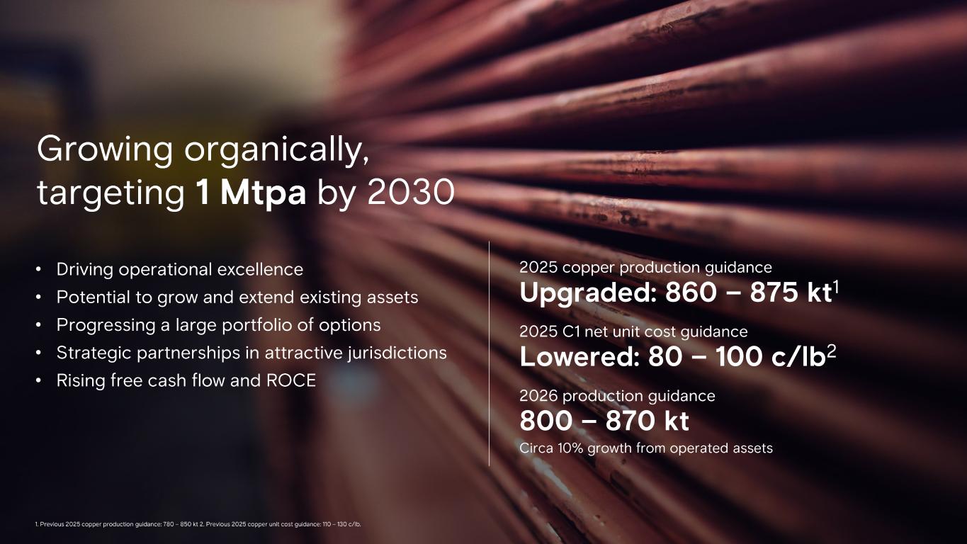 1 Operational excellence 2 Disciplined growth 3 Capital efficiency Growing organically, targeting 1 Mtpa by 2030 • Driving operational excellence • Potential to grow and extend existing assets • Progressing a large portfolio of options • Strategic partnerships in attractive jurisdictions • Rising free cash flow and ROCE 2026 production guidance 800 – 870 kt Circa 10% growth from operated assets 2025 C1 net unit cost guidance Lowered: 80 – 100 c/lb 2 2025 copper production guidance Upgraded: 860 – 875 kt 1 1. Previous 2025 copper production guidance: 780 – 850 kt 2. Previous 2025 copper unit cost guidance: 110 – 130 c/lb.