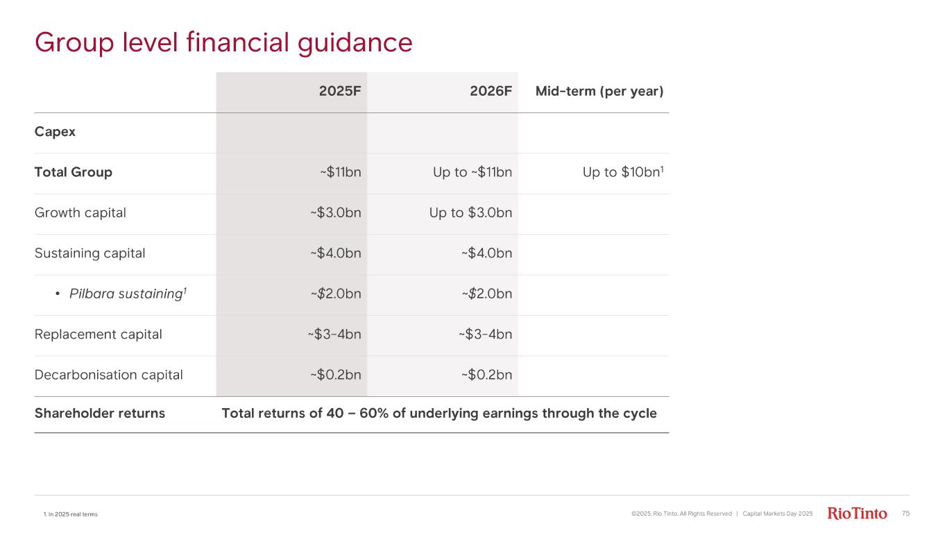 Group level financial guidance 1. In 2025 real terms ©2025, Rio Tinto, All Rights Reserved | Capital Markets Day 2025 2025F 2026F Mid- term (per year) Capex Total Group ~$11bn Up to ~$11bn Up to $10bn 1 Growth capital ~$3.0bn Up to $3.0bn Sustaining capital ~$4.0bn ~$4.0bn • Pilbara sustaining 1 ~$2.0bn ~$2.0bn Replacement capital ~$3 - 4bn ~$3 - 4bn Decarbonisation capital ~$0.2bn ~$0.2bn Shareholder returns Total returns of 40 – 60% of underlyin g earnings through the cycle 75