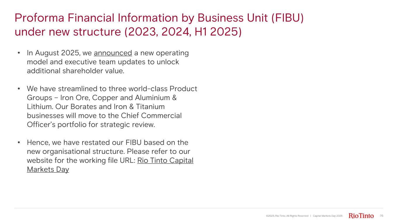 Proforma Financial Information by Business Unit (FIBU) under new structure (2023, 2024, H1 2025) ©2025, Rio Tinto, All Rights Reserved | Capital Markets Day 2025 • In August 2025, we announced a new operating model and executive team updates to unlock additional shareholder value. • We have streamlined to three world - class Product Groups – Iron Ore, Copper and Aluminium & Lithium. Our Borates and Iron & Titanium businesses will move to the Chief Commercial Officer’s portfolio for strategic review. • Hence, we have restated our FIB U based on the new organisational structure. Please refer to our website for the working file URL: Rio Tinto Capital Markets Day 76