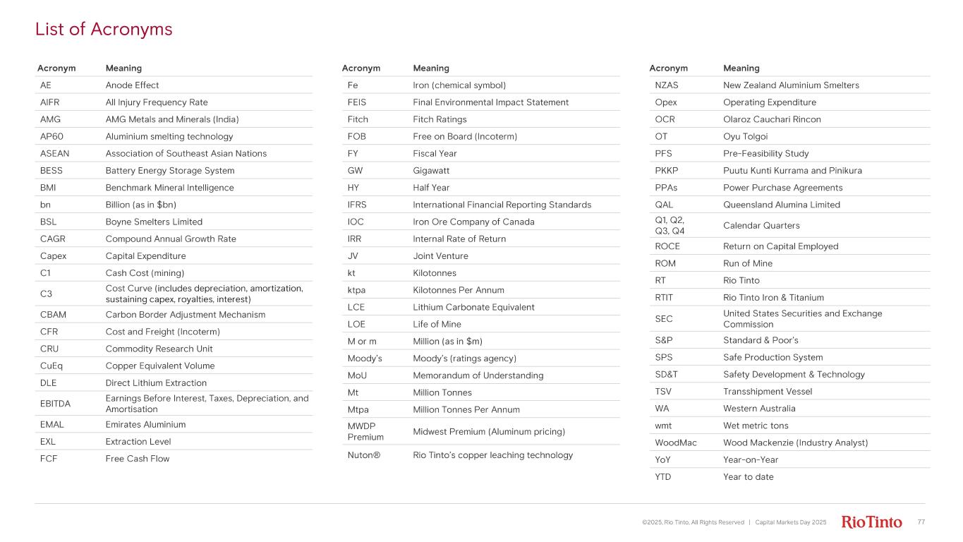 List of Acronyms 77©2025, Rio Tinto, All Rights Reserved | Capital Markets Day 2025 Acronym Meaning AE Anode Effect AIFR All Injury Frequency Rate AMG AMG Metals and Minerals (India) AP60 Aluminium smelting technology ASEAN Association of Southeast Asian Nations BESS Battery Energy Storage System BMI Benchmark Mineral Intelligence bn Billion (as in $bn) BSL Boyne Smelters Limited CAGR Compound Annual Growth Rate Capex Capital Expenditure C1 Cash Cost (mining) C3 Cost Curve ( includes depreciation, amortization, sustaining capex, royalties, interest) CBAM Carbon Border Adjustment Mechanism CFR Cost and Freight (Incoterm) CRU Commodity Research Unit CuEq Copper Equivalent Volume DLE Direct Lithium Extraction EBITDA Earnings Before Interest, Taxes, Depreciation, and Amortisation EMAL Emirates Aluminium EXL Extraction Level FCF Free Cash Flow Acronym Meaning Fe Iron (chemical symbol) FEIS Final Environmental Impact Statement Fitch Fitch Ratings FOB Free on Board (Incoterm) FY Fiscal Year GW Gigawatt HY Half Year IFRS International Financial Reporting Standards IOC Iron Ore Company of Canada IRR Internal Rate of Return JV Joint Venture kt Kilotonnes ktpa Kilotonnes Per Annum LCE Lithium Carbonate Equivalent LOE Life of Mine M or m Million (as in $m) Moody’s Moody’s (ratings agency) MoU Memorandum of Understanding Mt Million Tonnes Mtpa Million Tonnes Per Annum MWDP Premium Midwest Premium (Aluminum pricing) Nuton® Rio Tinto’s copper leaching technology Acronym Meaning NZAS New Zealand Aluminium Smelters Opex Operating Expenditure OCR Olaroz Cauchari Rincon OT Oyu Tolgoi PFS Pre - Feasibility Study PKKP Puutu Kunti Kurrama and Pinikura PPAs Power Purchase Agreements QAL Queensland Alumina Limited Q1, Q2, Q3, Q4 Calendar Quarters ROCE Return on Capital Employed ROM Run of Mine RT Rio Tinto RTIT Rio Tinto Iron & Titanium SEC United States Securities and Exchange Commission S&P Standard & Poor’s SPS Safe Production System SD&T Safety Development & Technology TSV Transshipment Vessel WA Western Australia wmt Wet metric tons WoodMac Wood Mackenzie (Industry Analyst) YoY Year - on - Year YTD Year to date