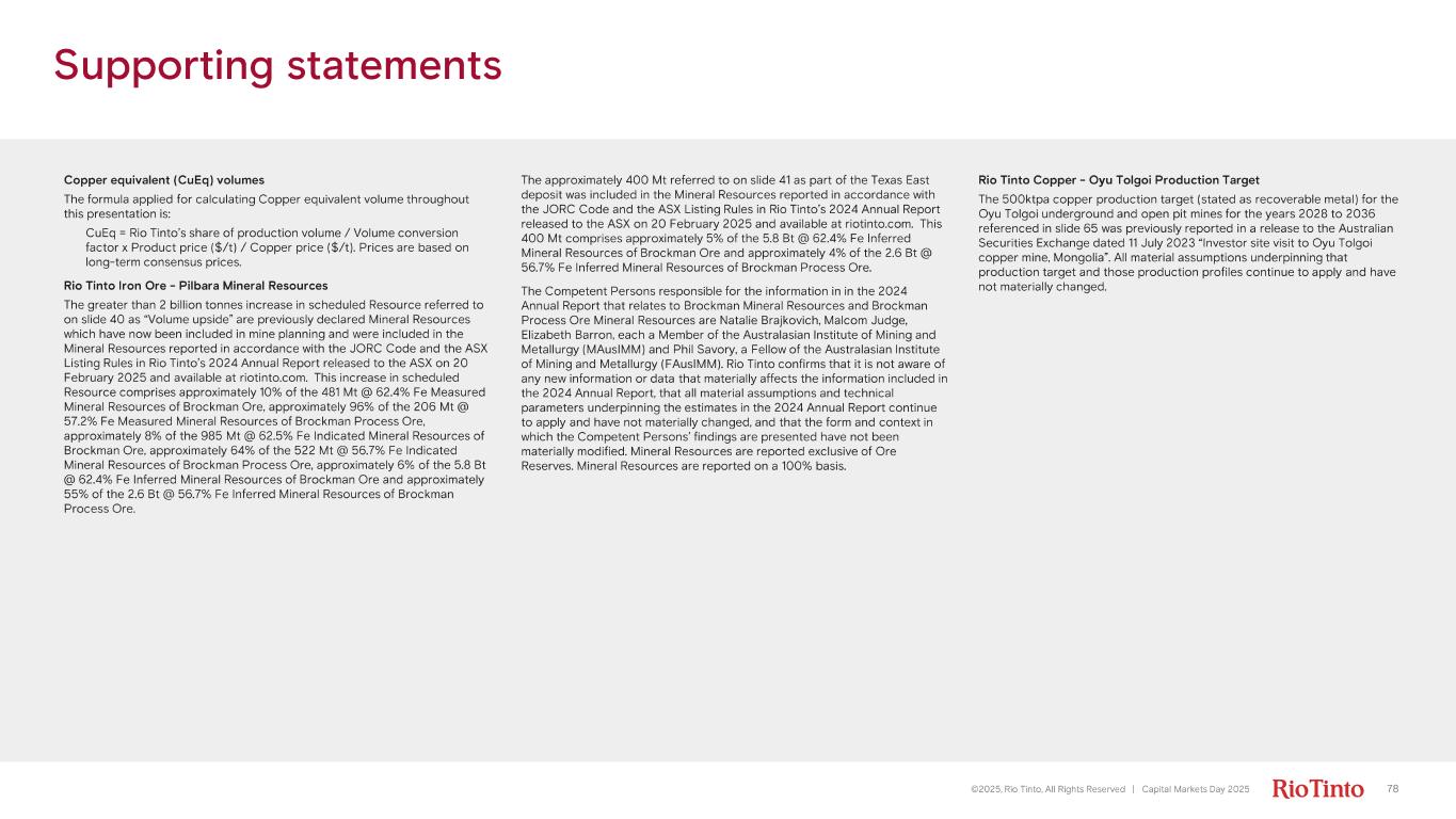Supporting statements 78©2025, Rio Tinto, All Rights Reserved | Capital Markets Day 2025 Copper equivalent ( CuEq ) volumes The formula applied for calculating Copper equivalent volume throughout this presentation is: CuEq = Rio Tinto’s share of production volume / Volume conversion factor x Product price ($/t) / Copper price ($/t). Prices are based on long - term consensus prices. Rio Tinto Iron Ore - Pilbara Mineral Resources The greater than 2 billion tonnes increase in scheduled Resource referred to on slide 40 as “Volume upside” are previously declared Mineral Resources which have now been included in mine planning and were included in the Mineral Resources reported in accordance with the JORC Code and the ASX Listing Rules in Rio Tinto’s 2024 Annual Report released to the ASX on 20 February 2025 and available at riotinto.com. This increase in scheduled Resource comprises approximately 10% of the 481 Mt @ 62.4% Fe Measured Mineral Resources of Brockman Ore, approximately 96% of the 206 Mt @ 57.2% Fe Measured Mineral Resources of Brockman Process Ore, approximately 8% of the 985 Mt @ 62.5% Fe Indicated Mineral Resources of Brockman Ore, approximately 64% of the 522 Mt @ 56.7% Fe Indicated Mineral Resources of Brockman Process Ore, approximately 6% of the 5.8 Bt @ 62.4% Fe Inferred Mineral Resources of Brockman Ore and approximately 55% of the 2.6 Bt @ 56.7% Fe Inferred Mineral Resources of Brockman Process Ore. The approximately 400 Mt referred to on slide 41 as part of the Texas East deposit was included in the Mineral Resources reported in accordance with the JORC Code and the ASX Listing Rules in Rio Tinto’s 2024 Annual Report released to the ASX on 20 February 2025 and available at riotinto.com. This 400 Mt comprises approximately 5% of the 5.8 Bt @ 62.4% Fe Inferred Mineral Resources of Brockman Ore and approximately 4% of the 2.6 Bt @ 56.7% Fe Inferred Mineral Resources of Brockman Process Ore. The Competent Persons responsible for the information in in the 2024 Annual Report that relates to Brockman Mineral Resources and Brockman Process Ore Mineral Resources are Natalie Brajkovich, Malcom Judge, Elizabeth Barron, each a Member of the Australasian Institute of Mining and Metallurgy ( MAusIMM ) and Phil Savory, a Fellow of the Australasian Institute of Mining and Metallurgy ( FAusIMM ). Rio Tinto confirms that it is not aware of any new information or data that materially affects the information included in the 2024 Annual Report, that all material assumptions and technical parameters underpinning the estimates in the 2024 Annual Report continue to apply and have not materially changed, and that the form and context in which the Competent Persons’ findings are presented have not been materially modified. Mineral Resources are reported exclusive of Ore Reserves. Mineral Resources are reported on a 100% basis. Rio Tinto Copper - Oyu Tolgoi Production Target The 500ktpa copper production target (stated as recoverable metal) for the Oyu Tolgoi underground and open pit mines for the years 2028 to 2036 referenced in slide 65 was previously reported in a release to the Australian Securities Exchange dated 11 July 2023 “Investor site visit to Oyu Tolgoi copper mine, Mongolia”. All material assumptions underpinning that production target and those production profiles continue to apply and have not materially changed.