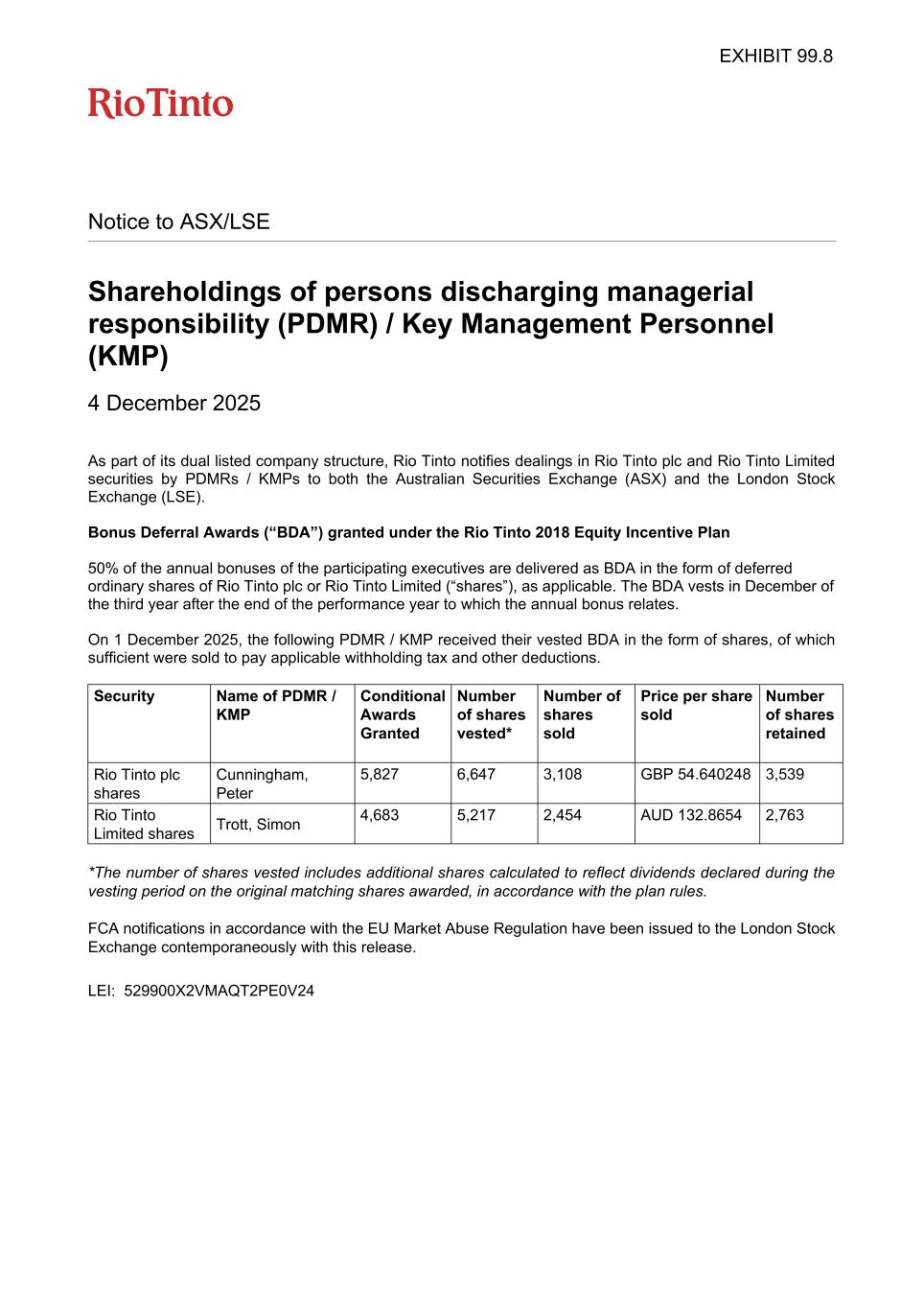 Notice to ASX/LSE Shareholdings of persons discharging managerial responsibility (PDMR) / Key Management Personnel (KMP) 4 December 2025 As part of its dual listed company structure, Rio Tinto notifies dealings in Rio Tinto plc and Rio Tinto Limited securities by PDMRs / KMPs to both the Australian Securities Exchange (ASX) and the London Stock Exchange (LSE). Bonus Deferral Awards (“BDA”) granted under the Rio Tinto 2018 Equity Incentive Plan 50% of the annual bonuses of the participating executives are delivered as BDA in the form of deferred ordinary shares of Rio Tinto plc or Rio Tinto Limited (“shares”), as applicable. The BDA vests in December of the third year after the end of the performance year to which the annual bonus relates. On 1 December 2025, the following PDMR / KMP received their vested BDA in the form of shares, of which sufficient were sold to pay applicable withholding tax and other deductions. Security Name of PDMR / KMP Conditional Awards Granted Number of shares vested* Number of shares sold Price per share sold Number of shares retained Rio Tinto plc shares Cunningham, Peter 5,827 6,647 3,108 GBP 54.640248 3,539 Rio Tinto Limited shares Trott, Simon 4,683 5,217 2,454 AUD 132.8654 2,763 *The number of shares vested includes additional shares calculated to reflect dividends declared during the vesting period on the original matching shares awarded, in accordance with the plan rules. FCA notifications in accordance with the EU Market Abuse Regulation have been issued to the London Stock Exchange contemporaneously with this release. LEI: 529900X2VMAQT2PE0V24 EXHIBIT 99.8