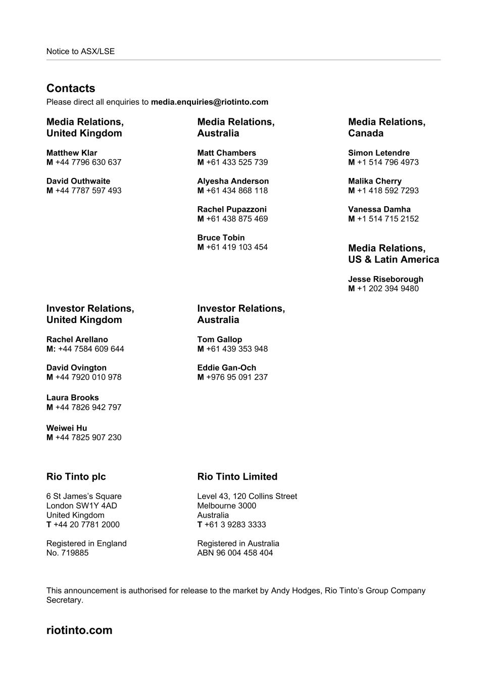 Notice to ASX/LSE Contacts Please direct all enquiries to media.enquiries@riotinto.com Media Relations, United Kingdom Matthew Klar M +44 7796 630 637 David Outhwaite M +44 7787 597 493 Media Relations, Australia Matt Chambers M +61 433 525 739 Alyesha Anderson M +61 434 868 118 Rachel Pupazzoni M +61 438 875 469 Bruce Tobin  M +61 419 103 454 Media Relations, Canada Simon Letendre M +1 514 796 4973 Malika Cherry M +1 418 592 7293 Vanessa Damha M +1 514 715 2152 Media Relations, US & Latin America Jesse Riseborough M +1 202 394 9480 Investor Relations, United Kingdom Rachel Arellano M: +44 7584 609 644 David Ovington M +44 7920 010 978 Laura Brooks M +44 7826 942 797 Weiwei Hu M +44 7825 907 230 Investor Relations, Australia Tom Gallop M +61 439 353 948 Eddie Gan-Och M +976 95 091 237 Rio Tinto plc 6 St James’s Square London SW1Y 4AD United Kingdom T +44 20 7781 2000 Registered in England No. 719885 Rio Tinto Limited Level 43, 120 Collins Street Melbourne 3000 Australia T +61 3 9283 3333 Registered in Australia ABN 96 004 458 404 This announcement is authorised for release to the market by Andy Hodges, Rio Tinto’s Group Company Secretary. riotinto.com