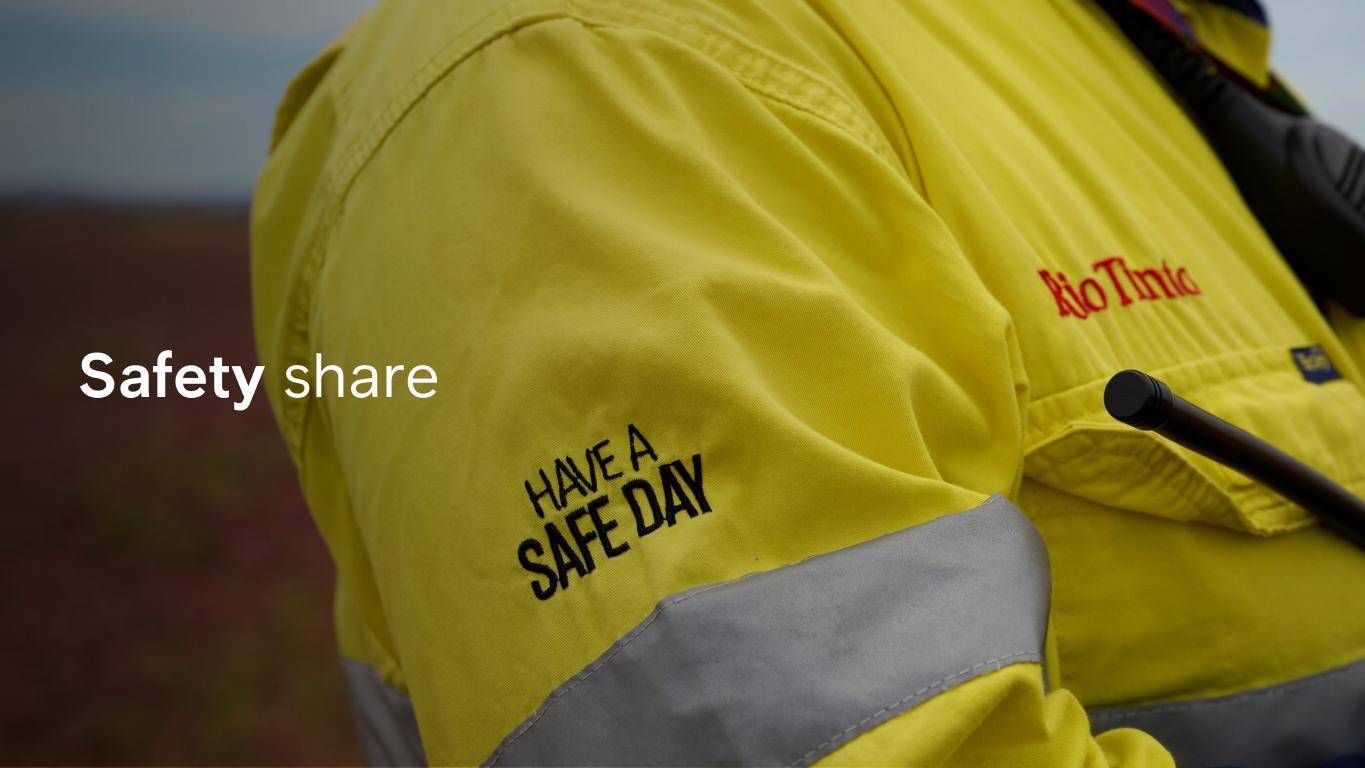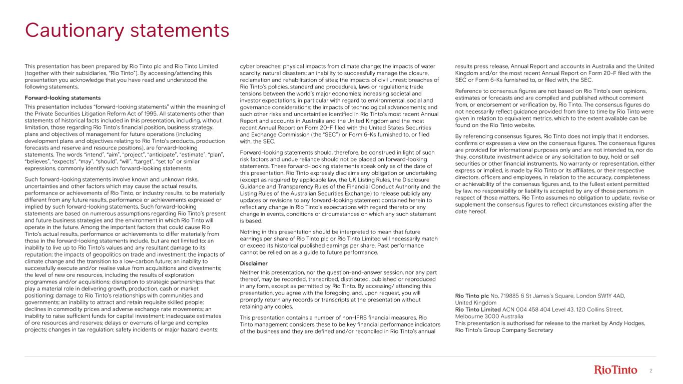2 Cautionary statements This presentation has been prepared by Rio Tinto plc and Rio Tinto Limited (together with their subsidiaries, “Rio Tinto”). By accessing/attending this presentation you acknowledge that you have read and understood the following statements. Forward - looking statements This presentation includes “forward - looking statements” within the meaning of the Private Securities Litigation Reform Act of 1995. All statements other than statements of historical facts included in this presentation, including, without limitation, those regarding Rio Tinto’s financial position, business strategy, plans and objectives of management for future operations (including development plans and objectives relating to Rio Tinto’s products, production forecasts and reserve and resource positions), are forward - looking statements. The words “intend”, “aim”, “project”, “anticipate”, “estimate”, “plan”, “believes”, “expects”, “may”, “should”, “will”, “target”, “set to” or similar expressions, commonly identify such forward - looking statements. Such forward - looking statements involve known and unknown risks, uncertainties and other factors which may cause the actual results, performance or achievements of Rio Tinto, or industry results, to be materially different from any future results, performance or achievements expressed or implied by such forward - looking statements. Such forward - looking statements are based on numerous assumptions regarding Rio Tinto’s present and future business strategies and the environment in which Rio Tinto will operate in the future. Among the important factors that could cause Rio Tinto’s actual results, performance or achievements to differ materially from those in the forward - looking statements include, but are not limited to: an inability to live up to Rio Tinto’s values and any resultant damage to its reputation; the impacts of geopolitics on trade and investment; the impacts of climate change and the transition to a low - carbon future; an inability to successfully execute and/or realise value from acquisitions and divestments; the level of new ore resources, including the results of exploration programmes and/or acquisitions; disruption to strategic partnerships that play a material role in delivering growth, production, cash or market positioning; damage to Rio Tinto’s relationships with communities and governments; an inability to attract and retain requisite skilled people; declines in commodity prices and adverse exchange rate movements; an inability to raise sufficient funds for capital investment; inadequate estimates of ore resources and reserves; delays or overruns of large and complex projects; changes in tax regulation; safety incidents or major hazard events; cyber breaches; physical impacts from climate change; the impacts of water scarcity; natural disasters; an inability to successfully manage the closure, reclamation and rehabilitation of sites; the impacts of civil unrest; breaches of Rio Tinto’s policies, standard and procedures, laws or regulations; trade tensions between the world’s major economies; increasing societal and investor expectations, in particular with regard to environmental, social and governance considerations; the impacts of technological advancements; and such other risks and uncertainties identified in Rio Tinto’s most recent Annual Report and accounts in Australia and the United Kingdom and the most recent Annual Report on Form 20 - F filed with the United States Securities and Exchange Commission (the “SEC”) or Form 6 - Ks furnished to, or filed with, the SEC. Forward - looking statements should, therefore, be construed in light of such risk factors and undue reliance should not be placed on forward - looking statements. These forward - looking statements speak only as of the date of this presentation. Rio Tinto expressly disclaims any obligation or undertaking (except as required by applicable law, the UK Listing Rules, the Disclosure Guidance and Transparency Rules of the Financial Conduct Authority and the Listing Rules of the Australian Securities Exchange) to release publicly any updates or revisions to any forward - looking statement contained herein to reflect any change in Rio Tinto’s expectations with regard thereto or any change in events, conditions or circumstances on which any such statement is based. Nothing in this presentation should be interpreted to mean that future earnings per share of Rio Tinto plc or Rio Tinto Limited will necessarily match or exceed its historical published earnings per share. Past performance cannot be relied on as a guide to future performance. Disclaimer Neither this presentation, nor the question - and - answer session, nor any part thereof, may be recorded, transcribed, distributed, published or reproduced in any form, except as permitted by Rio Tinto. By accessing/ attending this presentation, you agree with the foregoing, and, upon request, you will promptly return any records or transcripts at the presentation without retaining any copies. This presentation contains a number of non - IFRS financial measures. Rio Tinto management considers these to be key financial performance indicators of the business and they are defined and/or reconciled in Rio Tinto’s annual results press release, Annual Report and accounts in Australia and the United Kingdom and/or the most recent Annual Report on Form 20 - F filed with the SEC or Form 6 - Ks furnished to, or filed with, the SEC. Reference to consensus figures are not based on Rio Tinto’s own opinions, estimates or forecasts and are compiled and published without comment from, or endorsement or verification by, Rio Tinto. The consensus figures do not necessarily reflect guidance provided from time to time by Rio Tinto were given in relation to equivalent metrics, which to the extent available can be found on the Rio Tinto website. By refer