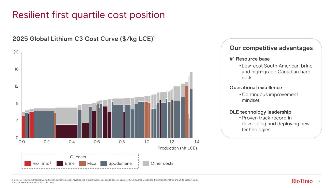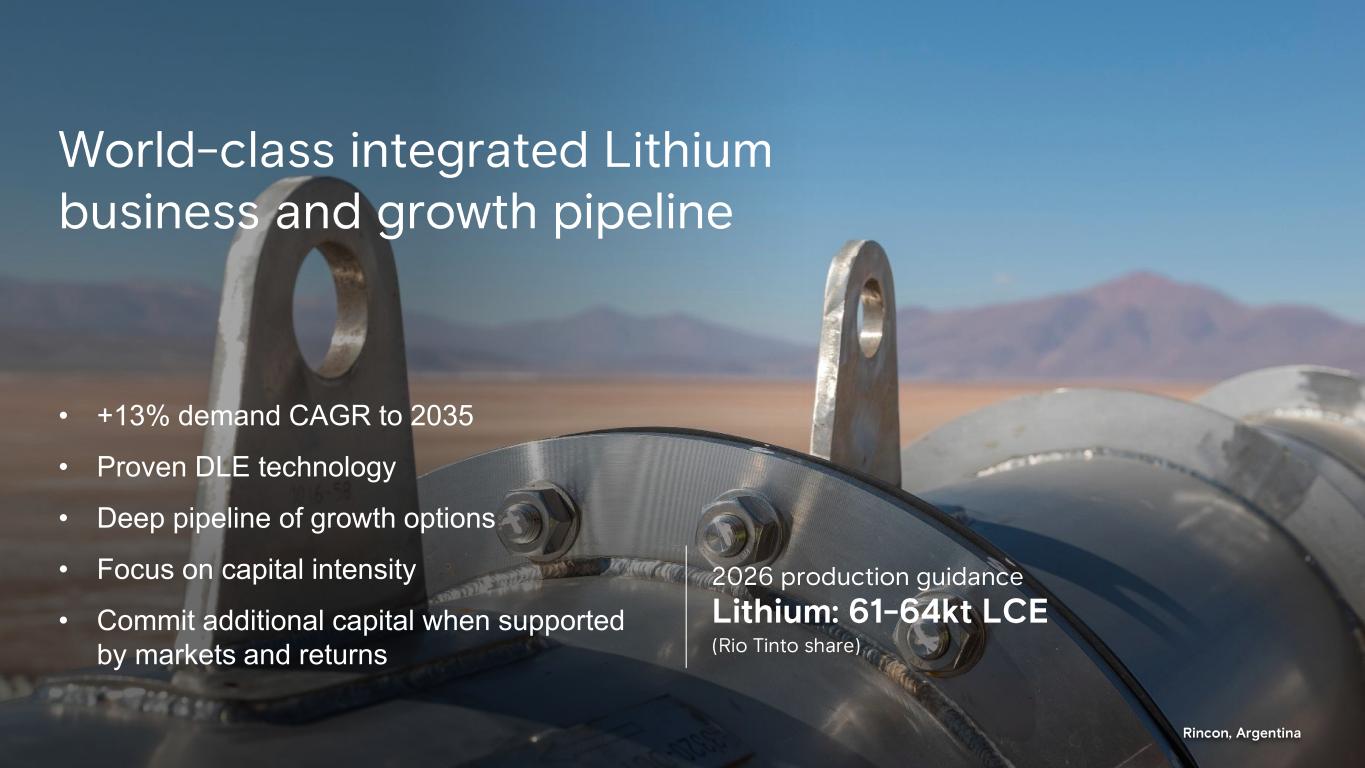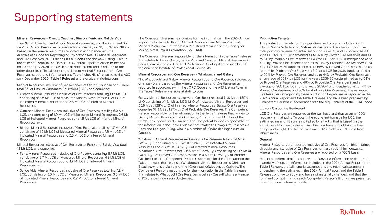 3 Supporting statements Mineral Resources - Olaroz , Cauchari, Rincon, Fenix and Sal de Vida The Olaroz , Cauchari and Rincon Mineral Resources, and the Fenix and Sal de Vida Mineral Resources referenced on slides 26, 29, 31, 36, 37 and 38 are based on the Mineral Resources reported in accordance with the Australasian Code for Reporting of Exploration Results, Mineral Resources and Ore Reserves, 2012 Edition ( JORC Code ) and the ASX Listing Rules, in the case of Rincon, in Rio Tinto’s 2024 Annual Report released to the ASX on 20 February 2025 and available at riotinto.com, and in relation to the other deposits in "Initial reporting of lithium Mineral Resources and Ore Reserves: supporting information and Table 1 checklists " released to the ASX on 4 December 2025 ( Table 1 Release ) and available at riotinto.com. Mineral Resources inclusive of Ore Reserves at Olaroz , Cauchari and Rincon total 37 Mt Lithium Carbonate Equivalent (LCE) , and comprise: • Olaroz Mineral Resources inclusive of Ore Reserves totalling 19.7 Mt LCE, consisting of 8.5 Mt LCE of Measured Mineral Resources, 8.4 Mt LCE of Indicated Mineral Resources and 2.8 Mt LCE of Inferred Mineral Resources. • Cauchari Mineral Resources inclusive of Ore Reserves totalling 6.0 Mt LCE, and consisting of 1.9 Mt LCE of Measured Mineral Resources, 2.6 Mt LCE of Indicated Mineral Resources and 1.5 Mt LCE of Inferred Mineral Resources; and • Rincon Mineral Resources inclusive of Ore Reserves totalling 11.7 Mt LCE, consisting of 1.5 Mt LCE of Measured Mineral Resources, 7.9 Mt LCE of Indicated Mineral Resources and 2.3 Mt LCE of Inferred Mineral Resources. Mineral Resources inclusive of Ore Reserves at Fenix and Sal de Vida total 19 Mt LCE, and comprise: • Fenix Mineral Resources inclusive of Ore Reserves totalling 11.7 Mt LCE, consisting of 2.7 Mt LCE of Measured Mineral Resources, 4.3 Mt LCE of Indicated Mineral Resources and 4.7 Mt LCE of Inferred Mineral Resources; and • Sal de Vida Mineral Resources inclusive of Ore Reserves totalling 7.2 Mt LCE, consisting of 3.5 Mt LCE of Measured Mineral Resources, 3.0 Mt LCE of Indicated Mineral Resources and 0.7 Mt LCE of Inferred Mineral Resources. The Competent Persons responsible for the information in the 2024 Annual Report that relates to Rincon Mineral Resources are Megan Zivic and Michael Rosko, each of whom is a Registered Member of the Society for Mining, Metallurgy & Exploration (SME - RM). The Competent Person responsible for the information in the Table 1 release that relates to Fenix, Olaroz , Sal de Vida and Cauchari Mineral Resources is Sean Kosinski, who is a Certified Professional Geologist and a member of the American Institute of Professional Geologists. Mineral Resources and Ore Reserves - Whabouchi and Galaxy The Whabouchi and Galaxy Mineral Resources and Ore Reserves referenced on slide 40 are based on the Mineral Resources and Ore Reserves as reported in accordance with the JORC Code and the ASX Listing Rules in the Table 1 Release available at riotinto.com. Galaxy Mineral Resources exclusive of Ore Reserves total 74.0 Mt at 1.25% Li 2O consisting of 18.1 Mt at 1.12% Li 2O of Indicated Mineral Resources and 55.9 Mt at 1.29% Li 2O of Inferred Mineral Resources. Galaxy Ore Reserves comprise 37.3 Mt at 1.27% Li 2O of Probable Ore Reserves. The Competent Person responsible for the information in the Table 1 release that relates to Galaxy Mineral Resources is Luke Evans, P.Eng., who is a Member of the l’Ordre des Ingénieurs du Québec. The Competent Persons responsible for the information in the Table 1 release that relates to Galaxy Ore Reserves is Normand Lecuyer, P.Eng., who is a Member of l’Ordre des Ingénieurs du Québec. Whabouchi Mineral Resources exclusive of Ore Reserves total 26.9 Mt at 1.45% Li 2O, consisting of 18.7 Mt at 1.51% Li 2O of Indicated Mineral Resources and 8.3 Mt at 1.31% Li 2O of Inferred Mineral Resources. Whabouchi Ore Reserves total 26.5 Mt at 1.32% Li 2O consisting of 10.5 Mt at 1.40% Li 2O of Proved Ore Reserves and 16.0 Mt at 1.27% Li 2O of Probable Ore Reserves. The Competent Person responsible for the information in the Table 1 release that relates to Whabouchi Mineral Resources is Christian Beaulieu, who is a Member of the l’Ordre des géologues du Québec. The Competent Persons responsible for the information in the Table 1 release that relates to Whabouchi Ore Reserves is Jeffrey Cassoff who is a Member of l’Ordre des Ingénieurs du Québec. Production Targets The production targets for the operations and projects including Fenix, Olaroz , Sal de Vida, Rincon, Galaxy, Nemaska and Cauchari. support the total portfolio revenue potential set out on slides 46 and 49 comprise 93 ktpa LCE for 2027 ( underpinned as to 97% by Proved Ore Reserves and as to 3% by Probable Ore Reserves); 114 ktpa LCE for 2028 ( underpinned as to 79% by Proved Ore Reserves and as to 21% by Probable Ore Reserves); 174 ktpa LCE for 2029 ( underpinned as to 56% by Proved Ore Reserves and as to 44% by Probable Ore Reserves); 212 ktpa LCE for 2030 ( underpinned as to 56% by Proved Ore Reserves and as to 44% by Probable Ore Reserves); an average of 331 ktpa LCE for the years 2031 - 35 ( underpinned as to 54% by Proved Ore Reserves and 46% by Probable Ore Reserves); and an average of 365 ktpa LCE for the years 2036 - 40 ( underpinned as to 14% by Proved Ore Reserves and 86% by Probable Ore Reserves). The estimated Ore Reserves underpinning these production targets are as reported in the 2024 Annual Report and the Table 1 Release, and have been prepared by Competent Persons in accordance with the requirements of the JORC code. Lithium Carbonate Equivalent LCE Ore Reserves are reported at the well head and thus assume 100% recovery at that point. To obtain the equivalent tonnage for LCE, the estimated mass of lithium is multiplied by a factor that is based on the atomic weights of each element in lithium carbonate to obtain the final compound weight. The fa