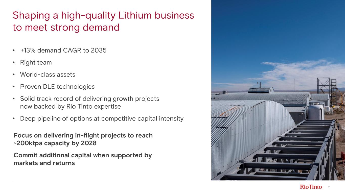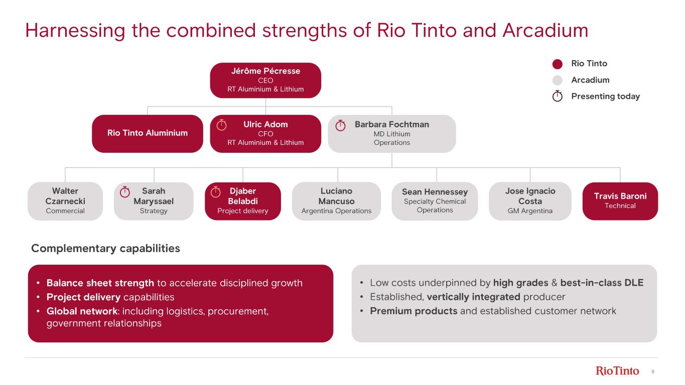 7 Shaping a high - quality Lithium business to meet strong demand • +13% demand CAGR to 2035 • Right team • World - class assets • Proven DLE technologies • Solid track record of delivering growth projects now backed by Rio Tinto expertise • Deep pipeline of options at competitive capital intensity Focus on delivering in - flight projects to reach ~200ktpa capacity by 2028 Commit additional capital when supported by markets and returns