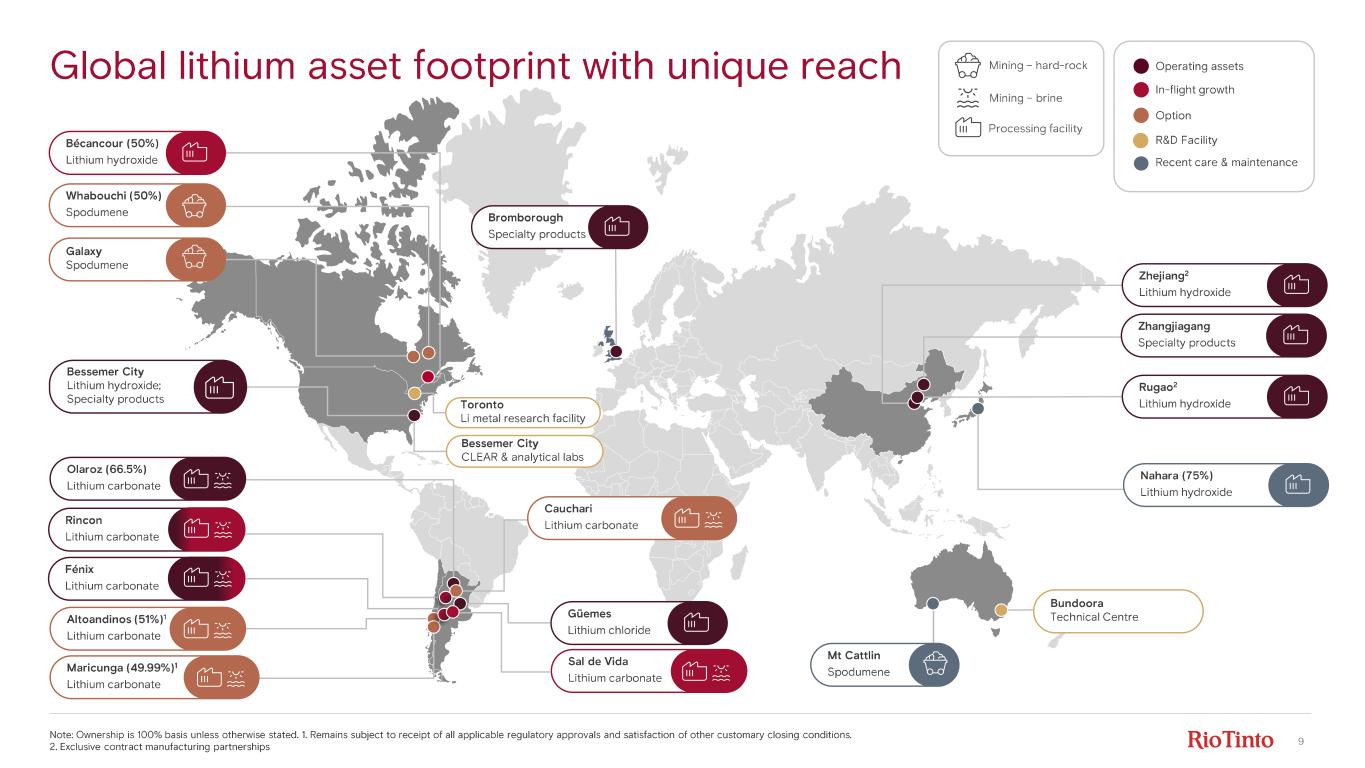 8 Harnessing the combined strengths of Rio Tinto and Arcadium Rio Tinto Jérôme Pécresse CEO RT Aluminium & Lithium Ulric Adom CFO RT Aluminium & Lithium Barbara Fochtman MD Lithium Operations Rio Tinto Aluminium Complementary capabilities • Balance sheet strength to accelerate disciplined growth • Project delivery capabilities • Global network : including logistics, procurement , government relationships Arcadium Presenting today • Low costs underpinned by high grades & best - in- class DLE • Established, vertically integrated producer • Premium products and established customer network Sarah Maryssael Strategy Djaber Belabdi Project delivery Luciano Mancuso Argentina Operations Sean Hennessey Specialty Chemical Operations Travis Baroni Technical Walter Czarnecki Commercial Jose Ignacio Costa GM Argentina