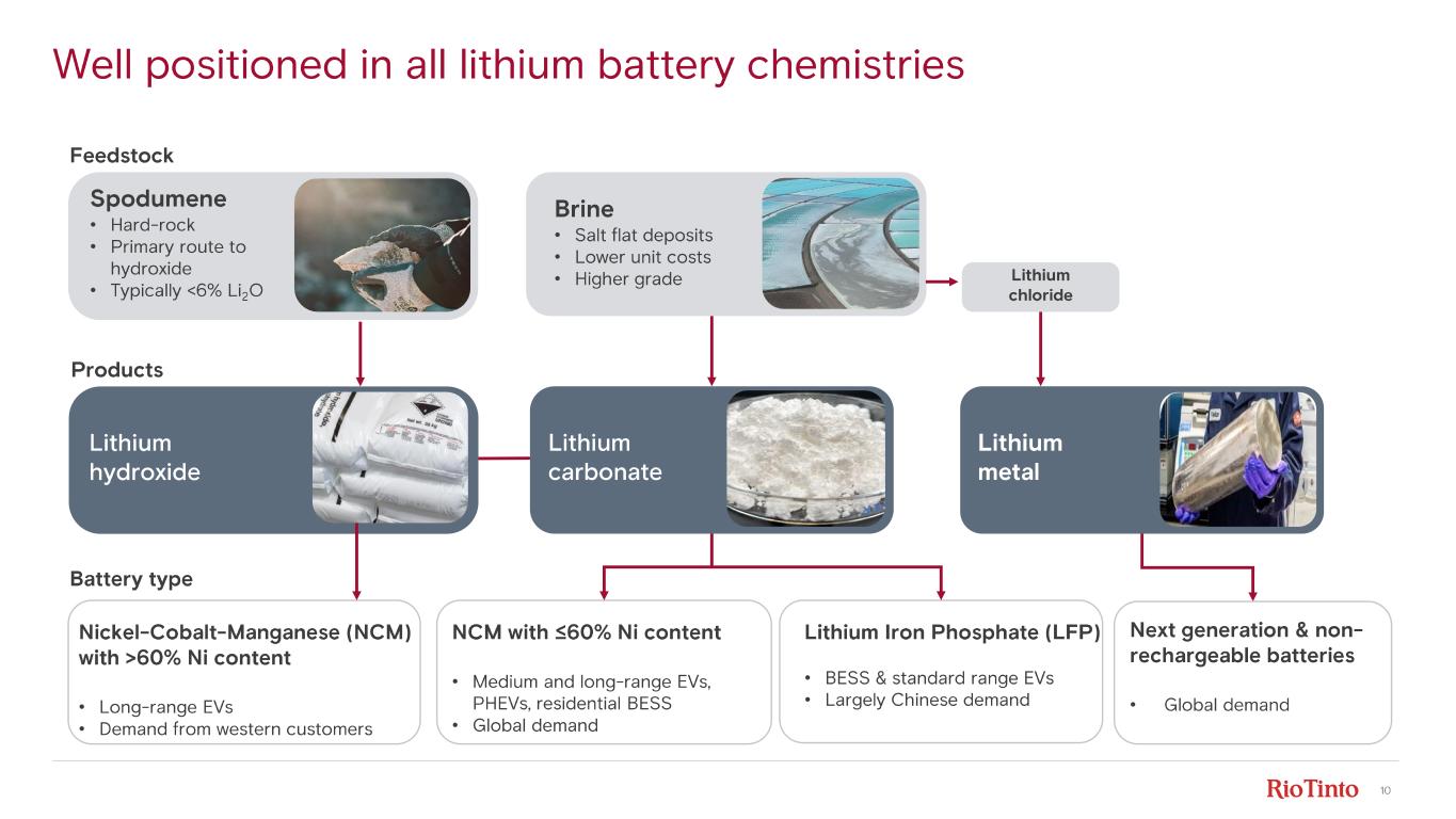 9 Sal de Vida Lithium carbonate Altoandinos (51%) 1 Lithium carbonate Global lithium asset footprint with unique reach Note: Ownership is 100% basis unless otherwise stated. 1. Remains subject to receipt of all applicable regulatory approvals and satisfaction of other customary closing conditions . 2. Exclusive contract manufacturing partnerships Mining – hard - rock Processing facility Mining – brine Toronto Li metal research facility Bessemer City CLEAR & analytical labs Operating assets In- flight growth Option Recent care & maintenance R&D Facility Bécancour (50%) Lithium hydroxide Whabouchi (50%) Spodumene Galaxy Spodumene Bessemer City Lithium hydroxide; Specialty products Olaroz (66.5%) Lithium carbonate Rincon Lithium carbonate Fénix Lithium carbonate Maricunga (49.99%) 1 Lithium carbonate Bromborough Specialty products Cauchari Lithium carbonate Güemes Lithium chloride Zhejiang 2 Lithium hydroxide Zhangjiagang Specialty products Rugao 2 Lithium hydroxide Nahara (75%) Lithium hydroxide Bundoora Technical Centre Mt Cattlin Spodumene