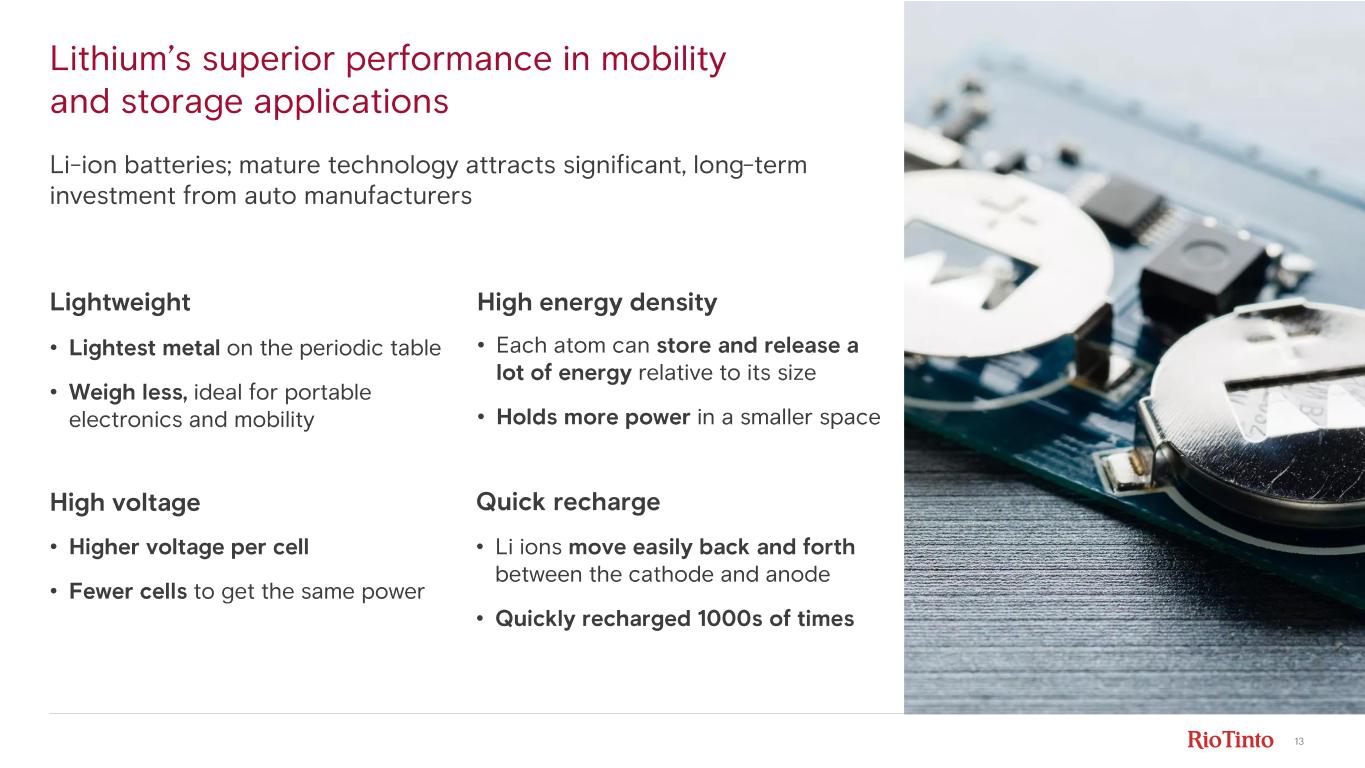 12 Energy transition creates a durable and expanding lithium market 1. Source: Rio Tinto Economics Global electricity demand will outpace GDP growth (3.4% vs 2.2%) 1 The age of electrification is accelerating due to environmental, geopolitical and economic factors • Climate and decarbonisation goals • Enhance energy security • Economic advantages • Policy and regulation • Technological advancements 10 20 30 40 50 60 70 80 0 2010 2015 2024 2030 F 2035 F 2040 F 2045 F 2050 F 21 23 31 38 45 53 64 74 74% 2.7% 3.4% Fossil fuel Nuclear Hydro Solar Wind Other Renewable 000, TWh per year
