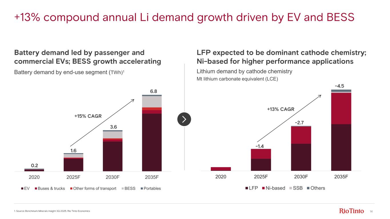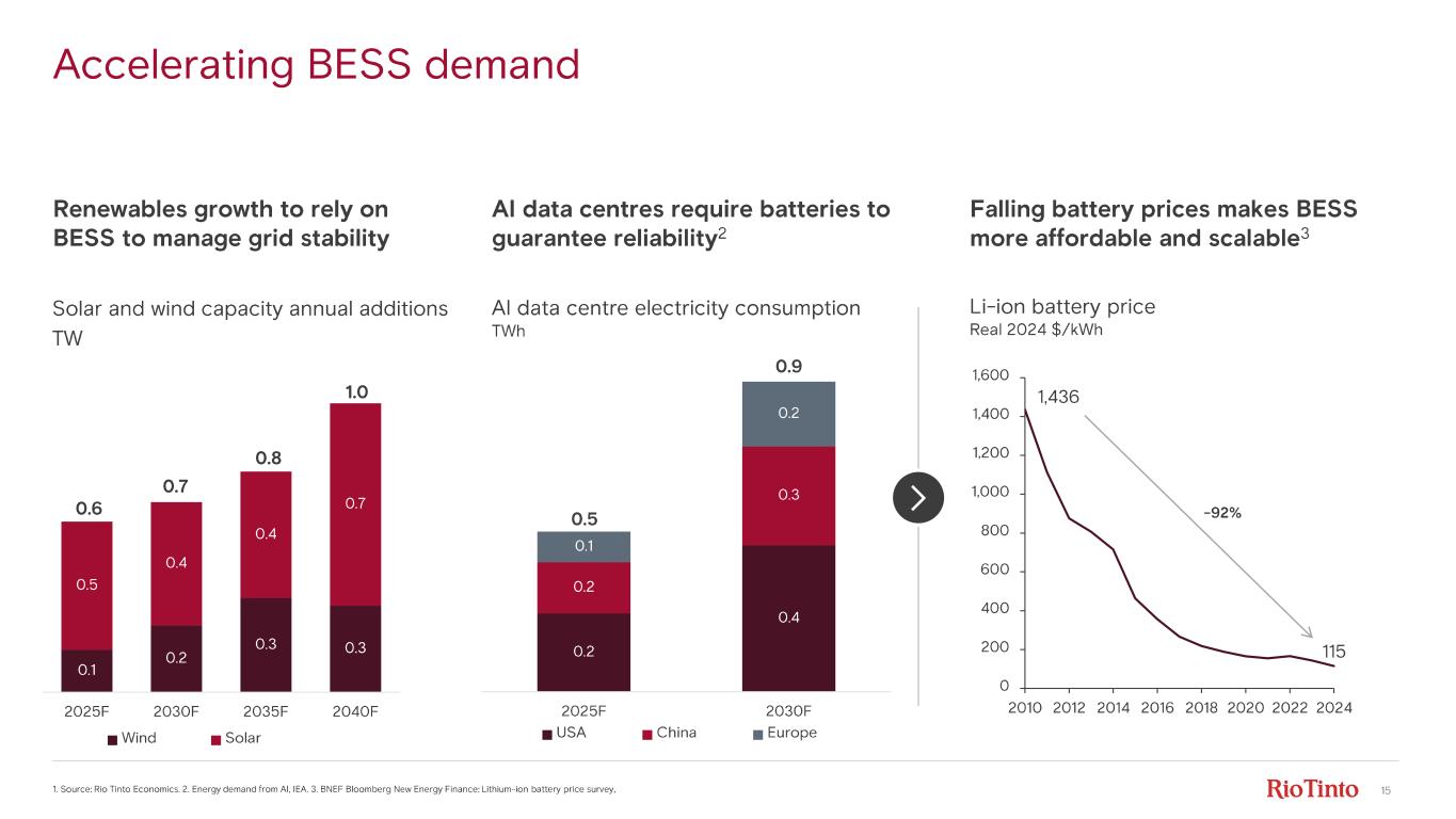 14 2020 2025F 2030F 2035F LFP Ni-based SSB Others 2020 2025F 2030F 2035F EV Buses & trucks Other forms of transport BESS Portables +13% compound annual Li demand growth driven by EV and BESS 1. Source: Benchmark Minerals Insight 3Q 2025, Rio Tinto Economics Battery demand by end-use segment (TWh)1 Battery demand led by passenger and commercial EVs; BESS growth accelerating 0.2 1.6 6.8 Lithium demand by cathode chemistry Mt lithium carbonate equivalent (LCE) LFP expected to be dominant cathode chemistry; Ni- based for higher performance applications 3.6 +15% CAGR ~2.7 ~4.5 ~1.4 +13% CAGR