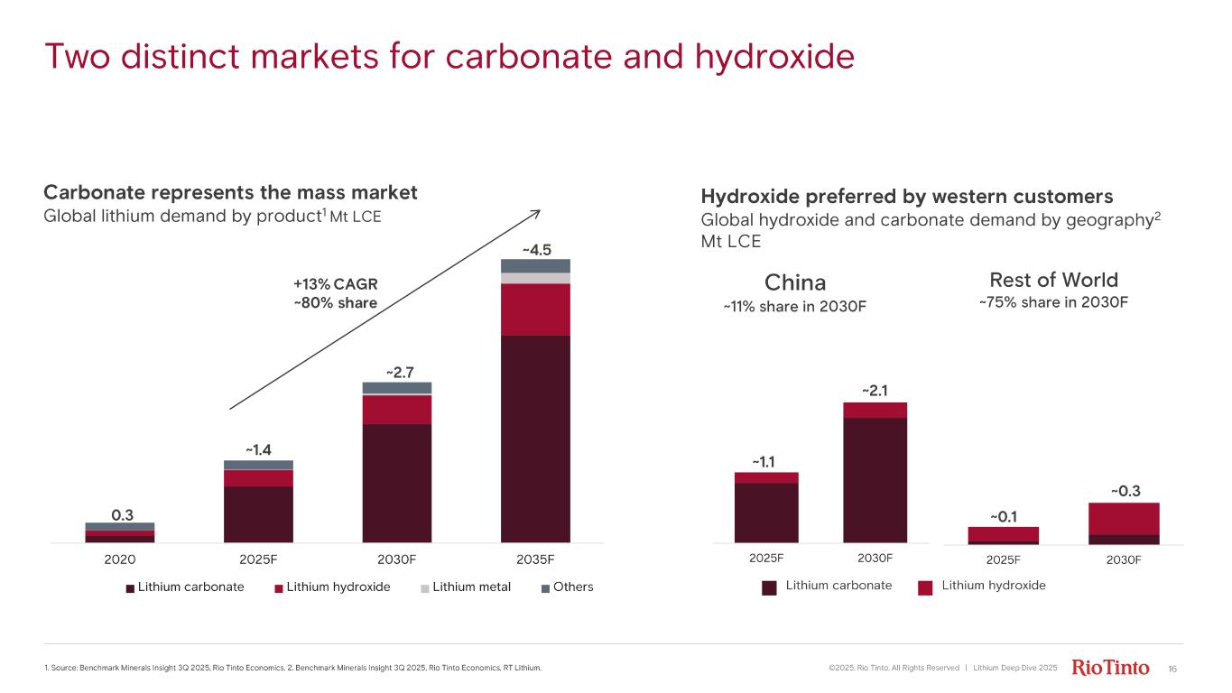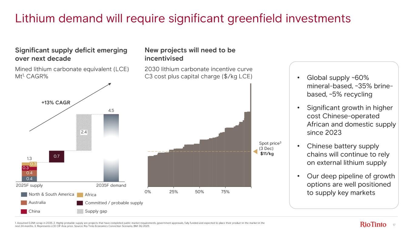 16 2025F 2030F Two distinct markets for carbonate and hydroxide ©2025, Rio Tinto, All Rights Reserved | Lithium Deep Dive 20251. Source: Benchmark Minerals Insight 3Q 2025, Rio Tinto Economics. 2. Benchmark Minerals Insight 3Q 2025, Rio Tinto Economics, RT Lithi um. Carbonate represents the mass market Global lithium demand by product 1 Mt LCE Hydroxide preferred by western customers Global hydroxide and carbonate demand by geography 2 Mt LCE 2020 2025F 2030F 2035F Lithium carbonate Lithium hydroxide Lithium metal Others ~2.7 ~4.5 0.3 ~1.4 +13% CAGR ~80% share Lithium carbonate Lithium hydroxide Rest of World ~75% share in 2030F China ~11% share in 2030F 2025F 2030F ~0.1 ~0.3 ~2.1 ~1.1