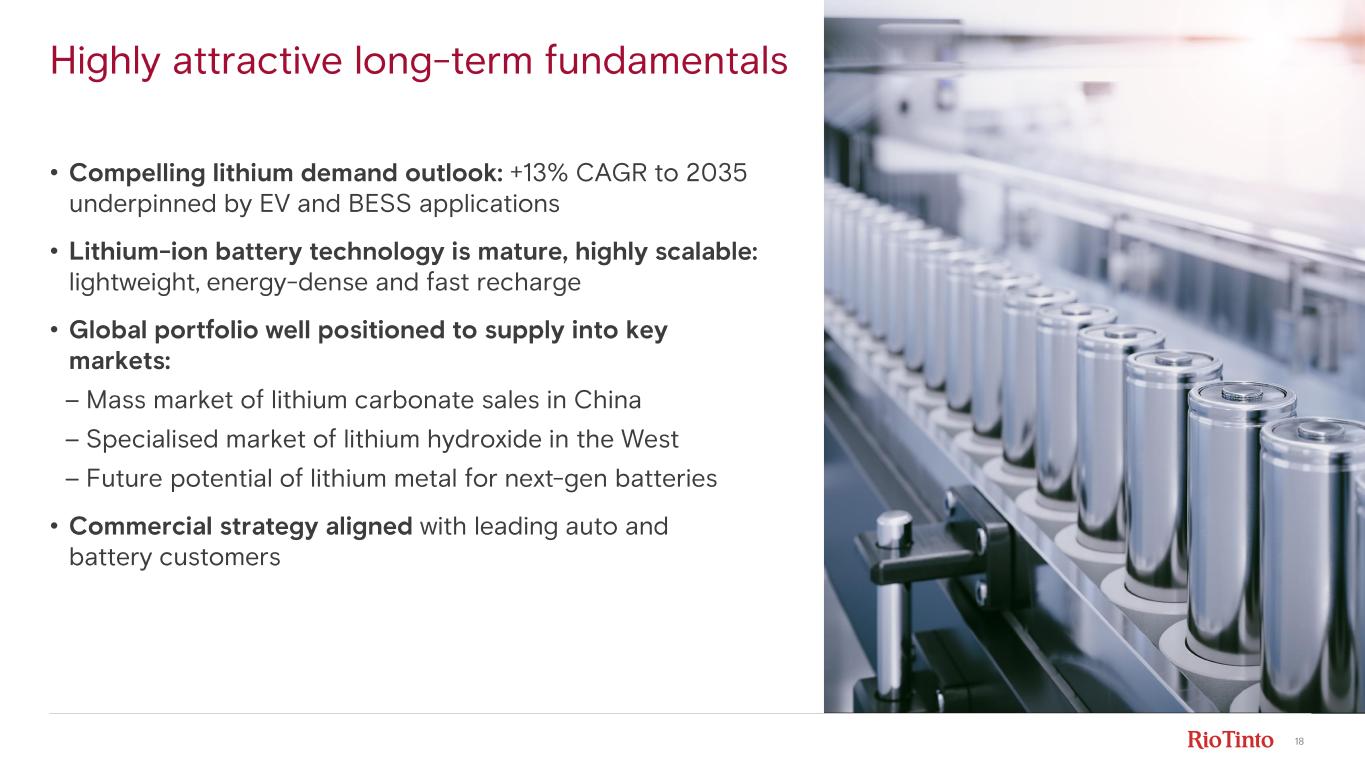 17 Lithium demand will require significant greenfield investments 1. Assumed 0.2Mt scrap in 2035. 2. Highly probable supply are projects that have completed public market requirements, govern men t approvals, fully funded and expected to place their product in the market in the next 24 months. 3. Represents LCE CIF Asia price. Source: Rio Tinto Economics Conviction Scenario, BMI 3Q 2025 Significant supply deficit emerging over next decade 2030 lithium carbonate incentive curve C3 cost plus capital charge ($/kg LCE) Mined lithium carbonate equivalent (LCE) Mt1, CAGR% New projects will need to be incentivised 0% 25% 75%50% Spot price 3 (3 Dec) $11/kg 0.4 4.5 0.4 0.7 0.3 0.3 2025F supply 2.4 2035F demand 1.3 +13% CAGR Africa China Australia North & South America Committed / probable supply Supply gap • Global supply ~60% mineral - based, ~35% brine - based, ~5% recycling • Significant growth in higher cost Chinese - operated African and domestic supply since 2023 • Chinese battery supply chains will continue to rely on external lithium supply • Our deep pipeline of growth options are well positioned to supply key markets