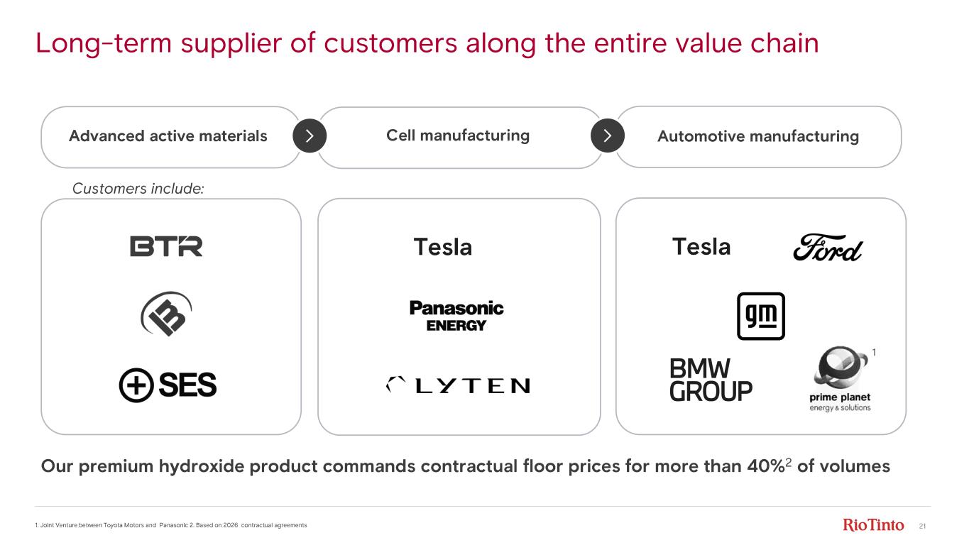20 Diverse product mix into global end markets Battery grade lithium hydroxide Battery grade lithium carbonate Non - battery lithium hydroxide Technical grade lithium carbonate High purity lithium metal Butyllithium & other specialties G lo b al e n d m ar ke ts • Mobility/ EVs • Grid - scale energy storage • AI infrastructure • Defence • High performance greases • Glass • Ceramics • Construction • Other industrials • Next generation batteries • Aerospace • Non - rechargeable batteries • Defence • Pharmaceuticals • Agrochemicals • Polymers • Semiconductors P ro d u ct m ix