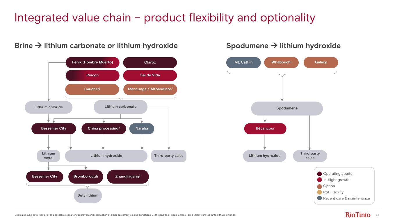 21 Long - term supplier of customers along the entire value chain Advanced active materials Cell manufacturing Automotive manufacturing Our premium hydroxide product commands contractual floor prices for more than 40% 2 of volumes 1. Joint Venture between Toyota Motors and Panasonic 2. Based on 2026 contractual agreements Customers include: Tesla Tesla 1
