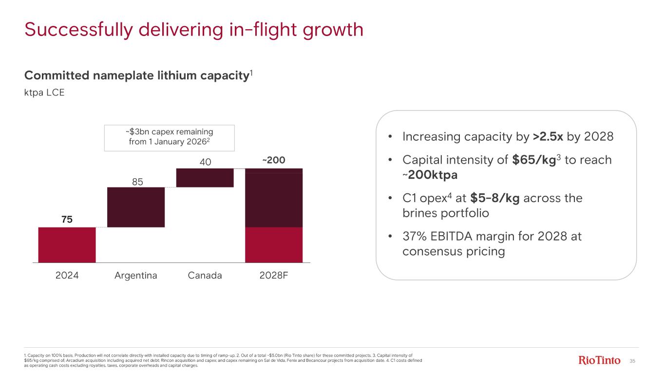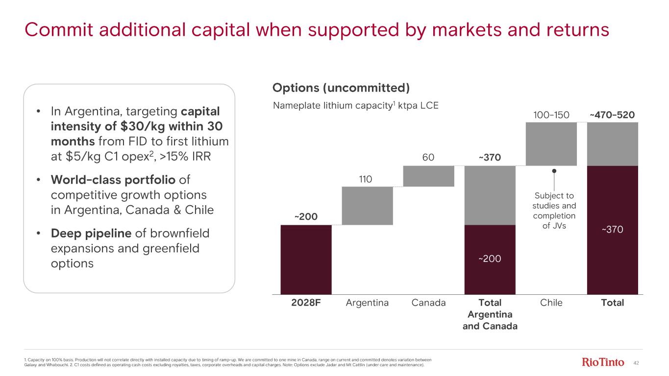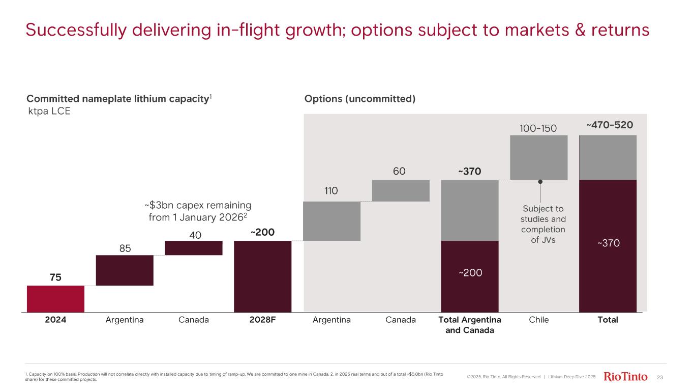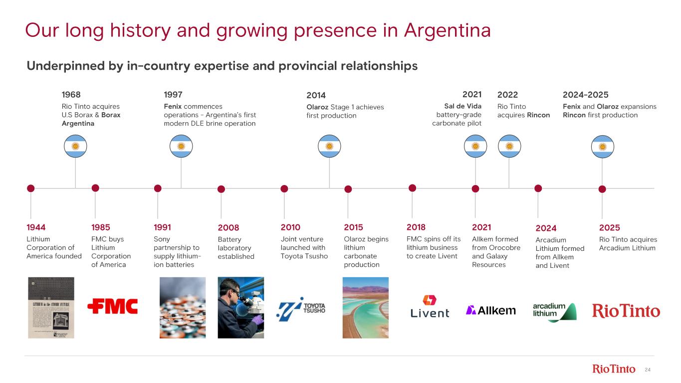 23 Successfully delivering in - flight growth; options subject to markets & returns ©2025, Rio Tinto, All Rights Reserved | Lithium Deep Dive 2025 1. Capacity on 100% basis. Production will not correlate directly with installed capacity due to timing of ramp - up. We are committed to one mine in Canada. 2. in 2025 real terms and out of a total ~$5.0bn (Rio Tinto share) for these committed projects. ktpa LCE Committed nameplate lithium capacity 1 Options (uncommitted) Subject to studies and completion of JVs 100 - 150 ~470 - 520 75 2024 Argentina Canada 2028F Argentina Canada Total Argentina and Canada Chile Total ~200 ~370 100 - 150 ~$3bn capex remaining from 1 January 2026 2 ~200 110 60 ~470 - 520 ~370 85 40
