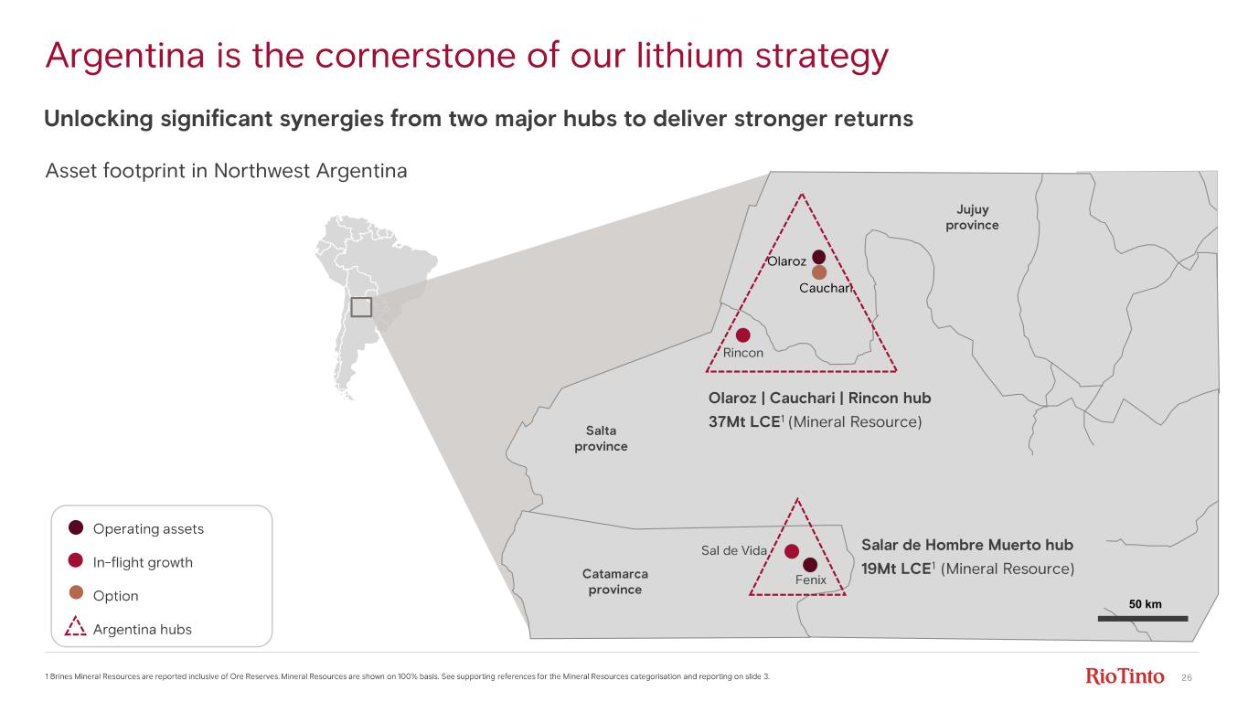 25 Uniquely positioned through strong and collaborative engagement Federal • Established national mining code • Set financial frameworks (RIGI) Provincial ownership • Control and grant mining rights • Align with national law and have primary environmental authority Working effectively with local stakeholders • Largest mining employer: – 2,000+ full - time employees – 70% local workforce from host provinces • $600m+ 1 local procurement, supporting 100+ local suppliers • $7m 1 invested in community programs, participation agreements & infrastructure • Alignment with IFC 2 Performance Standards and UN SDGs 3 25+ years continuous presence in Jujuy, Salta and Catamarca provinces 1. In 2024. 2. International Finance Corporation. 3. United Nations Sustainable Development Goals