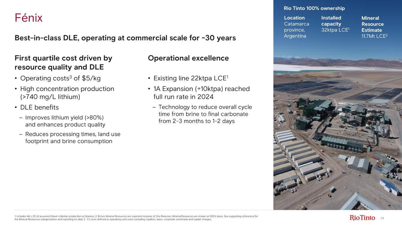 28 Resilient first quartile cost position 1. C3 costs include depreciation, amortization, sustaining capex, royalties and interest but exclude capital charge. Sources: BMI, CRU, Rho Motion, Rio Tinto Market Analysis and 2025 cost estimates 2. Current operational footprint (2025 plan) 4 0 1.41.21.00.80.60.40.20.0 20 16 12 8 Production (Mt LCE) 2025 Global Lithium C3 Cost Curve ($/kg LCE) 1 Rio Tinto 2 Brine Mica Spodumene Other costs C1 costs Our competitive advantages #1 Resource base • Low - cost South American brine and high - grade Canadian hard rock Operational excellence • Continuous improvement mindset DLE technology leadership • Proven track record in developing and deploying new technologies