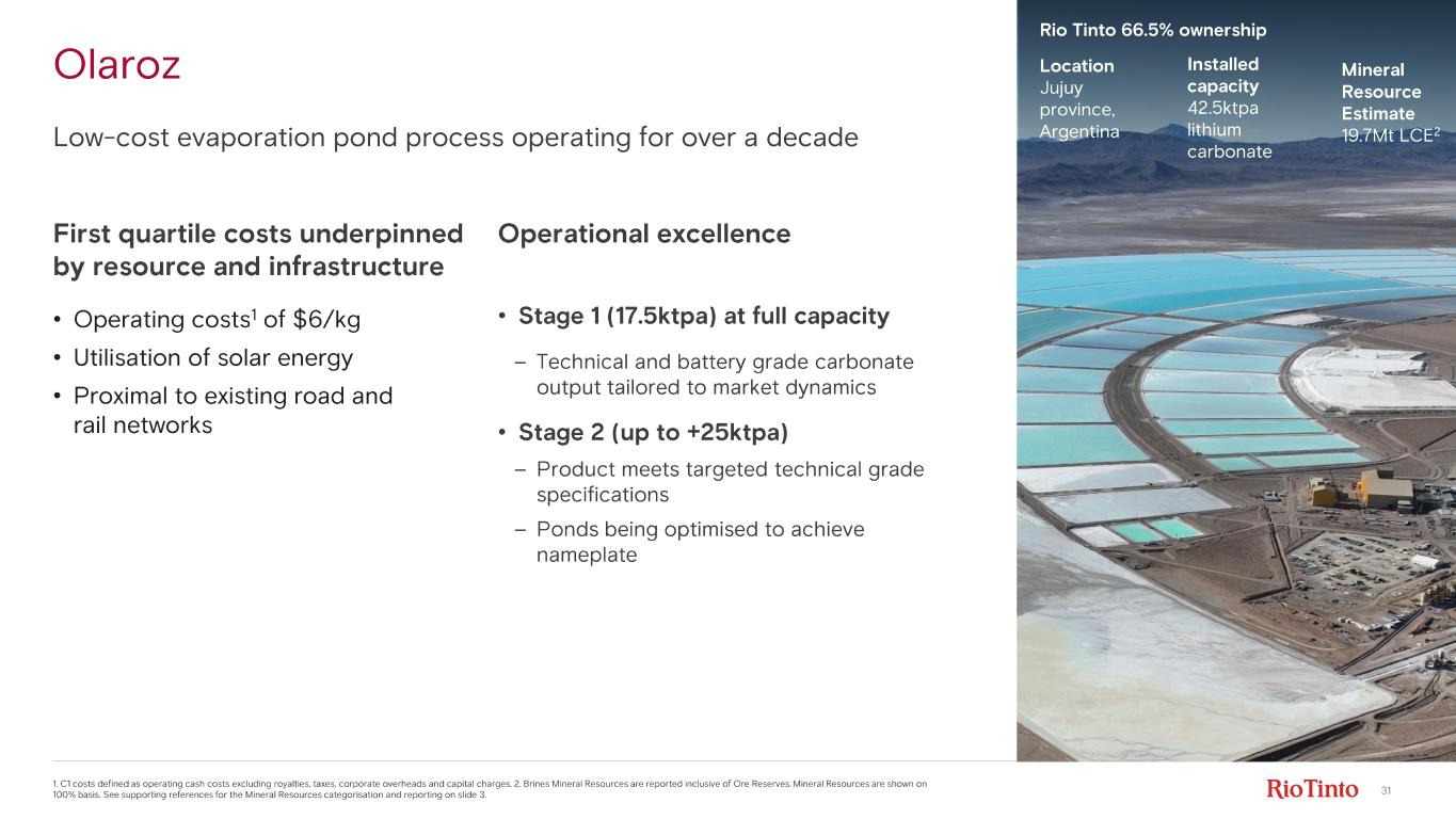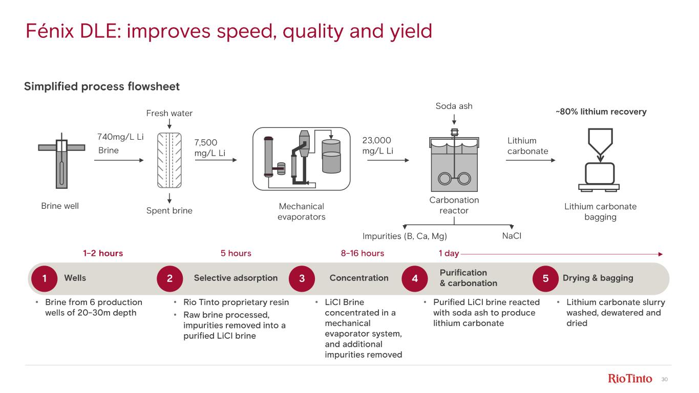 29 Fénix 1. Includes 4kt LCE of assumed lithium chloride production at Güemes. 2. Brines Mineral Resources are reported inclusive of Ore Reserves. Mineral Resources are shown on 100% basis. See supporting re ferences for the Mineral Resources categorisation and reporting on slide 3. C1 costs defined as operating cash costs excluding royalties, taxes, corporate overheads and capital charges. First quartile cost driven by resource quality and DLE • Operating costs 3 of $5/kg • High concentration production (>740 mg/L lithium) • DLE benefits – Improves lithium yield (>80%) and enhances product quality – Reduces processing times, land use footprint and brine consumption Operational excellence • Existing line 22ktpa LCE 1 • 1A Expansion (+10ktpa) reached full run rate in 2024 – Technology to reduce overall cycle time from brine to final carbonate from 2 - 3 months to 1 - 2 days Best - in- class DLE, operating at commercial scale for ~30 years Mineral Resource Estimate 11.7Mt LCE 2 Location Catamarca province, Argentina Installed capacity 32ktpa LCE 1 Rio Tinto 100% ownership
