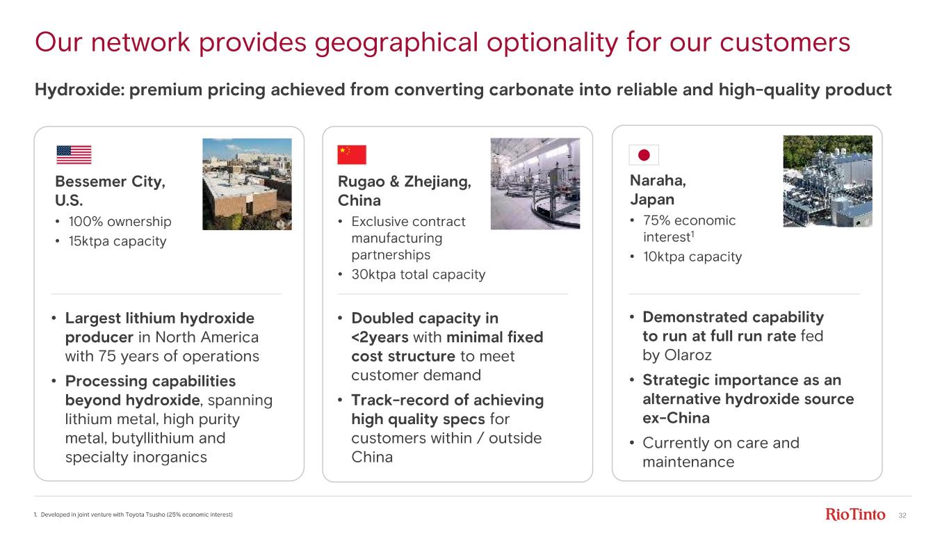 31 Olaroz 1. C1 costs defined as operating cash costs excluding royalties, taxes, corporate overheads and capital charges. 2. Brines Mineral Resources are reported inclusive of Ore Reserves. Mineral Resources are shown on 100% basis. See supporting references for the Mineral Resources categorisation and reporting on slide 3. First quartile costs underpinned by resource and infrastructure • Operating costs 1 of $6/kg • Utilisation of solar energy • Proximal to existing road and rail networks Operational excellence • Stage 1 (17.5ktpa) at full capacity – Technical and battery grade carbonate output tailored to market dynamics • Stage 2 (up to +25ktpa) – Product meets targeted technical grade specifications – Ponds being optimised to achieve nameplate Low - cost evaporation pond process operating for over a decade Mineral Resource Estimate 19.7Mt LCE 2 Location Jujuy province, Argentina Installed capacity 42.5ktpa lithium carbonate Rio Tinto 66.5% ownership