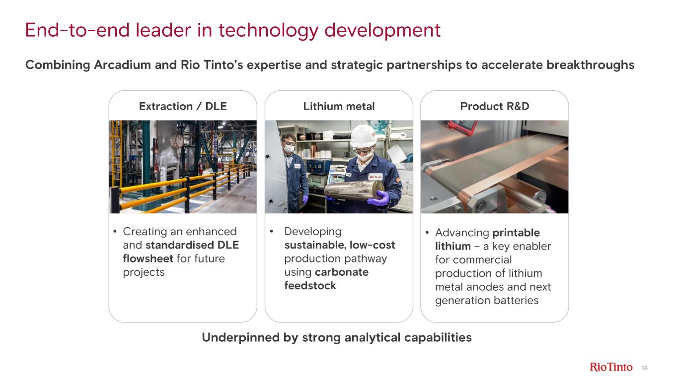 33 End - to- end leader in technology development Combining Arcadium and Rio Tinto’s expertise and strategic partnerships to accelerate breakthroughs • Developing sustainable, low - cost production pathway using carbonate feedstock • Advancing printable lithium – a key enabler for commercial production of lithium metal anodes and next generation batteries • Creating an enhanced and standardised DLE flowsheet for future projects Extraction / DLE Lithium metal Product R&D Underpinned by strong analytical capabilities