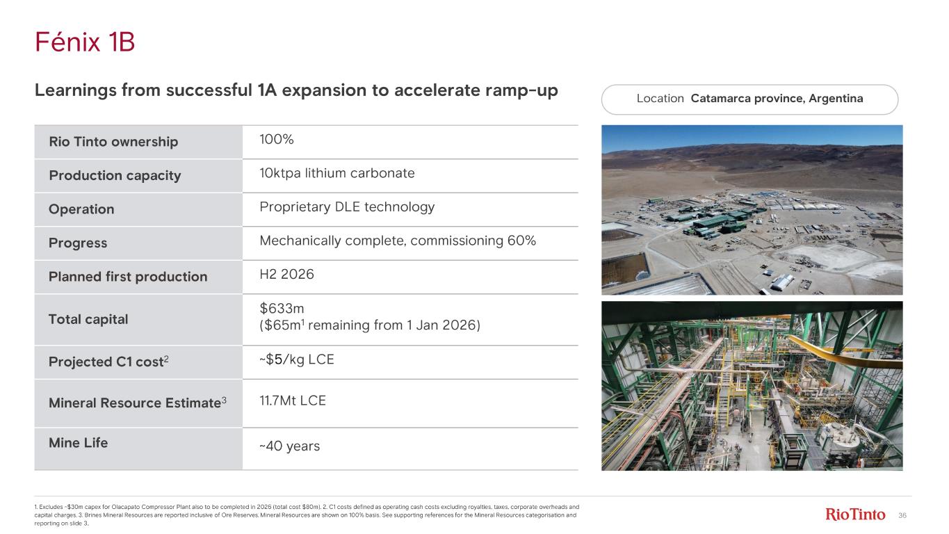 35 1. Capacity on 100% basis. Production will not correlate directly with installed capacity due to timing of ramp - up. 2 . Out of a total ~$5.0bn (Rio Tinto share) for these committed projects. 3. Capital intensity of $65/kg comprised of; Arcadium acquisition including acquired net debt; Rincon acquisition and capex; and capex remaining on S al de Vida, Fenix and Becancour projects from acquisition date. 4 . C1 costs defined as operating cash costs excluding royalties, taxes, corporate overheads and capital charges. 75 370 2024 Argentina Canada 2028F 10 Argentina Canada 170 190-200 Total Argentina and Canada 125 Chile 125 Total ~200 100 60-70 370 ~$3bn capex remaining from 1 January 2026 2 ktpa LCE Committed nameplate lithium capacity 1 • Increasing capacity by >2.5x by 2028 • Capital intensity of $65/kg 3 to reach ~20 ktpa • C1 opex 4 at $5 - 8/kg across the brines portfolio • 37% EBITDA margin for 2028 at consensus pricing Successfully delivering in - flight growth 85 40