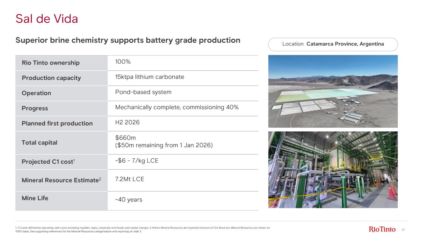 36 Rio Tinto ownership 100% Production capacity 10ktpa lithium carbonate Operation Proprietary DLE technology Progress Mechanically complete, commissioning 60% Planned first production H2 2026 Total capital $633m ($65m 1 remaining from 1 Jan 2026) Projected C1 cost 2 ~$5/kg LCE Mineral Resource Estimate 3 11.7Mt LCE Mine Life ~40 years F énix 1B Learnings from successful 1A expansion to accelerate ramp - up 1. Excludes ~$30m capex for Olacapato Compressor Plant also to be completed in 2026 (total cost $80m). 2. C1 costs defined as operating cash costs excluding royalties, taxes, corporate overheads and capital charges. 3. Brines Mineral Resources are reported inclusive of Ore Reserves. Mineral Resources are shown on 100% basis. See supporting re ferences for the Mineral Resources categorisation and reporting on slide 3.. Location Catamarca province, Argentina