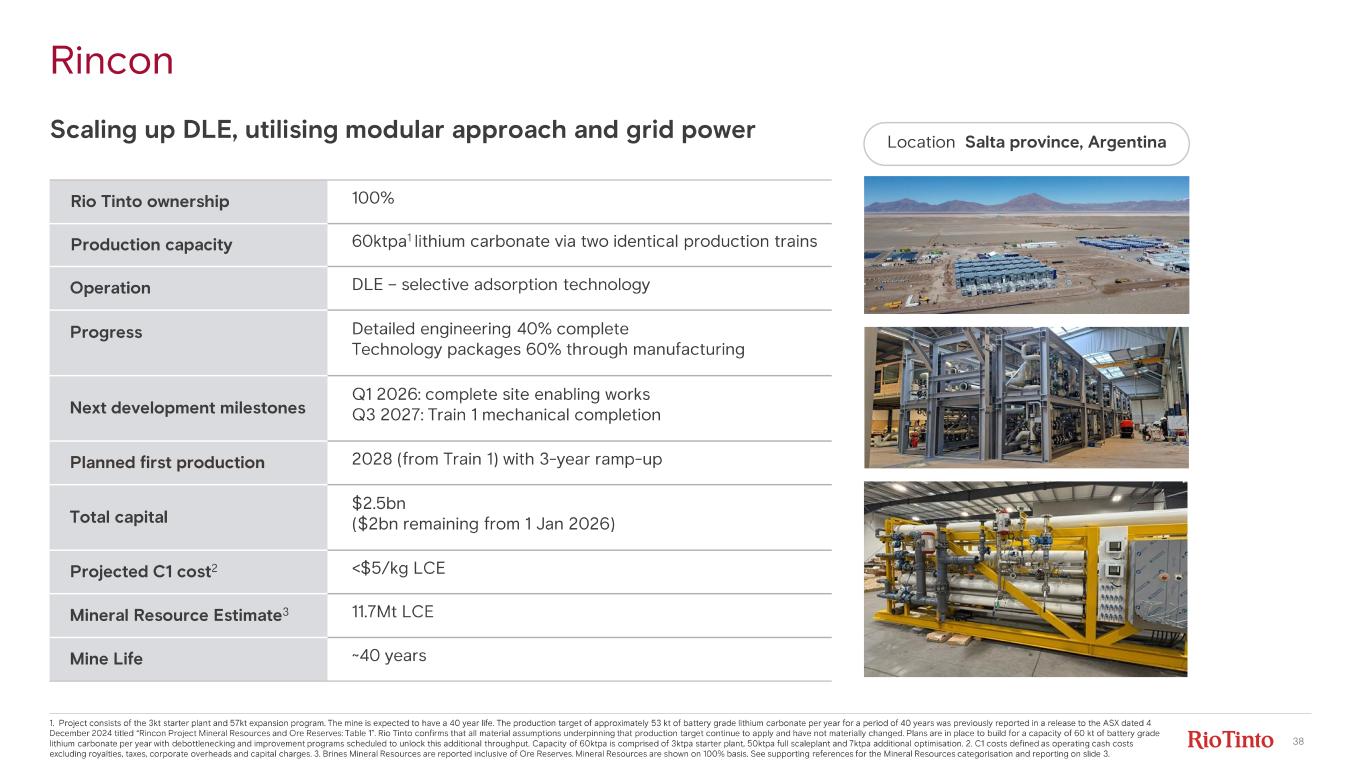 37 Sal de Vida Superior brine chemistry supports battery grade production 1. C1 costs defined as operating cash costs excluding royalties, taxes, corporate overheads and capital charges. 2. Brines Mineral Resources are reported inclusive of Ore Reserves. Mineral Resources are shown on 100% basis. See supporting references for the Mineral Resources categorisation and reporting on slide 3. Rio Tinto ownership 100% Production capacity 15ktpa lithium carbonate Operation Pond - based system Progress Mechanically complete, commissioning 40% Planned first production H2 2026 Total capital $660m ($50m remaining from 1 Jan 2026) Projected C1 cost 1 ~$6 - 7/kg LCE Mineral Resource Estimate 2 7.2Mt LCE Mine Life ~40 years Location Catamarca Province, Argentina