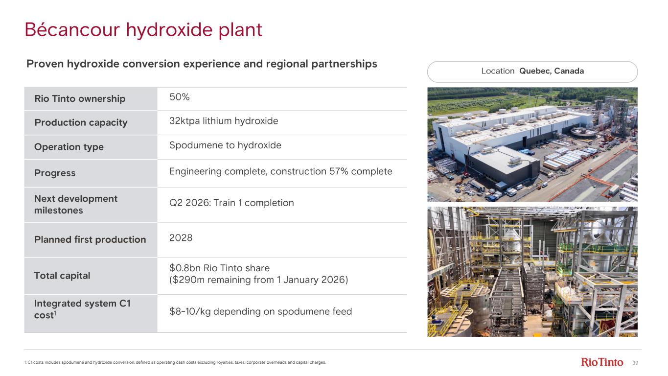 38 Rincon 1. Project consists of the 3kt starter plant and 57kt expansion program. The mine is expected to have a 40 year life. The production target of approximately 53 kt of battery grade lithium carbonate per year for a period of 40 years was previou sly reported in a release to the ASX dated 4 December 2024 titled “Rincon Project Mineral Resources and Ore Reserves: Table 1”. Rio Tinto confirms that all material assum ptions underpinning that production target continue to apply and have not materially changed. Plans are in place to build for a cap acity of 60 kt of battery grade lithium carbonate per year with debottlenecking and improvement programs scheduled to unlock this additional throughput. Capa city of 60ktpa is comprised of 3ktpa starter plant, 50ktpa full scaleplant and 7ktpa additional optimisation. 2. C1 costs defined as operating cash costs excluding royalties, taxes, corporate overheads and capital charges. 3. Brines Mineral Resources are reported inclusive of Ore Reserves. Mineral Resources are shown on 100% basis. See supporting re ferences for the Mineral Resources categorisation and reporting on slide 3. Site enabling works Membrane package Scaling up DLE, utilising modular approach and grid power Rio Tinto ownership 100% Production capacity 60ktpa 1 lithium carbonate via two identical production trains Operation DLE – selective adsorption technology Progress Detailed engineering 40% complete Technology packages 60% through manufacturing Next development milestones Q1 2026: complete site enabling works Q3 2027: Train 1 mechanical completion Planned first production 2028 (from Train 1) with 3 - year ramp - up Total capital $2.5bn ($2bn remaining from 1 Jan 2026) Projected C1 cost 2 <$5/kg LCE Mineral Resource Estimate 3 11.7Mt LCE Mine Life ~40 years Location Salta province, Argentina
