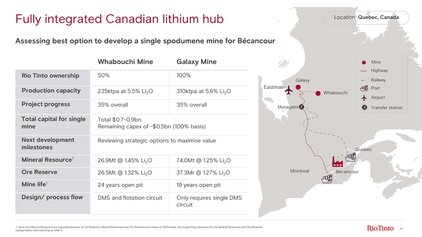 39 Bécancour hydroxide plant Proven hydroxide conversion experience and regional partnerships Site enabling works Membrane package 1. C1 costs includes spodumene and hydroxide conversion, defined as operating cash costs excluding royalties, taxes, corporat e o verheads and capital charges. Rio Tinto ownership 50% Production capacity 32ktpa lithium hydroxide Operation type Spodumene to hydroxide Progress Engineering complete, construction 57% complete Next development milestones Q2 2026: Train 1 completion Planned first production 2028 Total capital $0.8bn Rio Tinto share ($290m remaining from 1 January 2026) Integrated system C1 cost 1 $8 - 10/kg depending on spodumene feed Location Quebec, Canada