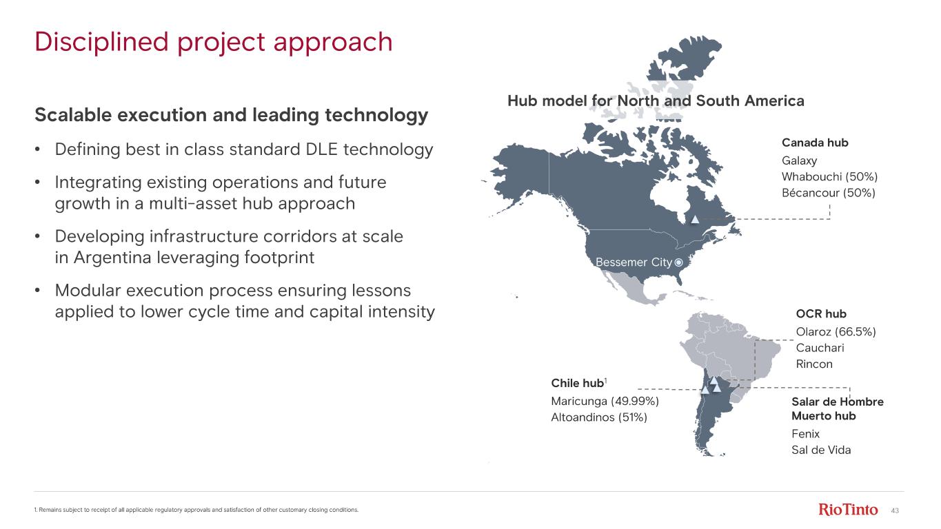 42 1. Capacity on 100% basis. Production will not correlate directly with installed capacity due to timing of ramp - up. We are committed to one mine in Canada, range on current and committed denotes variation between Galaxy and Whabouchi . 2. C1 costs defined as operating cash costs excluding royalties, taxes, corporate overheads and capital charges. Note: Options exclude Jadar and Mt Cattlin (under care and maintenance). Lithium 75 ~37085 Arcadium 2024 nameplate capacity Argentina 30 - 40 Canada 2028F Argentina Canada ~200 Total Argentina and Canada Chile Total ~200 ~370 • In Argentina, targeting capital intensity of $30/kg within 30 months from FID to first lithium at $5/kg C1 opex 2, >15% IRR • World - class portfolio of competitive growth options in Argentina, Canada & Chile • Deep pipeline of brownfield expansions and greenfield options Subject to studies and completion of JVs Nameplate lithium capacity 1 ktpa LCE Options (uncommitted) 100 - 150 ~470 - 520 Commit additional capital when supported by markets and returns 60 110