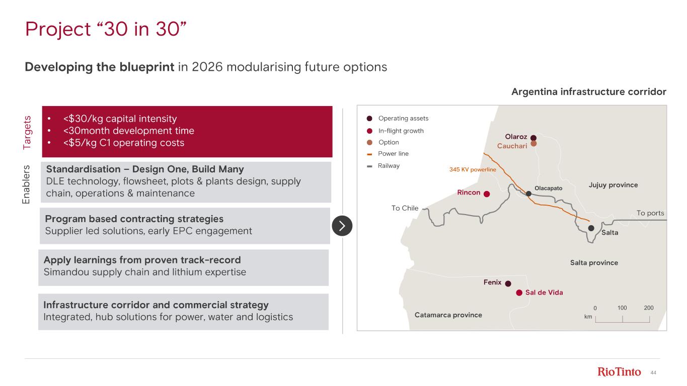 44 Project “30 in 30” Rincon Olaroz Catamarca province Salta province Sal de Vida Fenix Jujuy province Salta 0 100 200 km Rio Tinto Lithium 345 KV powerline Olacapato 33 KV 33 KV Power Lines (Current and Planned) Railway Rincon Olaroz Catamarca province Salta province Sal de Vida Fenix Jujuy province Salta 0 100 200 km 345 KV powerline Olacapato Ta rg et s En ab le rs Argentina infrastructure corridor Developing the blueprint in 2026 modularising future options Operating assets Power line Railway In- flight growth Standardisation – Design One, Build Many DLE technology, flowsheet , plots & plants design, supply chain, operations & maintenance Program based contracting strategies Supplier led solutions, early EPC engagement Infrastructure corridor and commercial strategy Integrated, hub solutions for power, water and logistics Apply learnings from proven track - record Simandou supply chain and lithium expertise • <$30/kg capital intensity • <30month development time • <$5/kg C1 operating costs Cauchari Option To Chile To ports