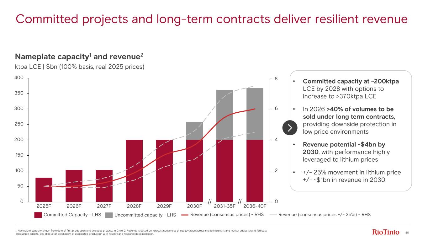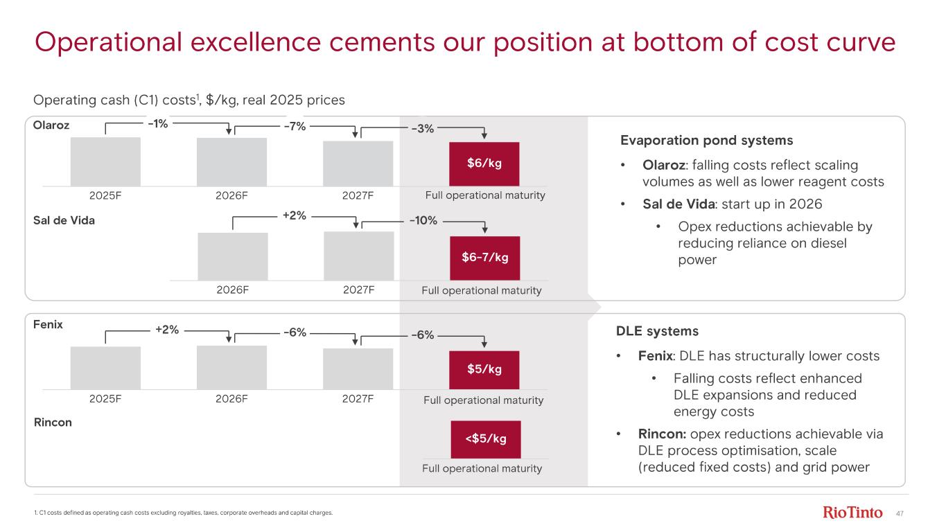 46 Committed projects and long - term contracts deliver resilient revenue 1. Nameplate capacity shown from date of first production and excludes projects in Chile. 2. Revenue is based on forecast con sen sus prices (average across multiple brokers and market analysts) and forecast production targets. See slide 3 for breakdown of associated production with reserve and resource decomposition. Nameplate capacity 1 and revenue 2 ktpa LCE | $bn (100% basis, real 2025 prices) 0 50 100 150 200 250 300 350 400 0 2 4 6 8 2025 F 2026 F 2027 F 2028 F 2029 F 2030 F 2031 - 35 F 2036 - 40 F Uncommitted capacity - LHSCommitted Capacity - LHS Revenue (consensus prices) - RHS Revenue (consensus prices +/ - 25%) - RHS • Committed capacity at ~200ktpa LCE by 2028 with options to increase to > 370ktpa LCE • In 2026 >40% of volumes to be sold under long term contracts, providing downside protection in low price environments • Revenue potential ~$4bn by 2030 , with performance highly leveraged to lithium prices • +/ - 25% movement in lithium price +/ - ~$1bn in revenue in 2030