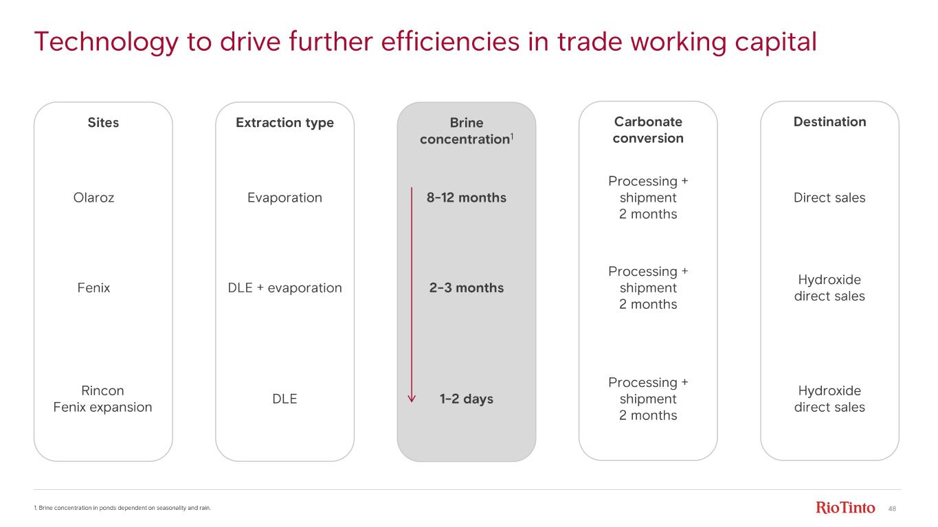 47 Evaporation pond systems • Olaroz : falling costs reflect scaling volumes as well as lower reagent costs • Sal de Vida : start up in 2026 • Opex reductions achievable by reducing reliance on diesel power Operational excellence cements our position at bottom of cost curve 1. C1 costs defined as operating cash costs excluding royalties, taxes, corporate overheads and capital charges. Fenix <$5/kg Rincon 2025 F 2026 F 2027 F $ 5/kg Full operational maturity +2% - 6% - 6% Olaroz Sal de Vida 2025 F 2026 F 2027 F $ 6/kg Full operational maturity - 1% - 7% - 3% 2026 F 2027 F $ 6- 7/kg Full operational maturity +2% - 10% Operating cash (C1) costs 1, $/kg, real 2025 prices Full operational maturity DLE systems • Fenix : DLE has structurally lower costs • Falling costs reflect enhanced DLE expansions and reduced energy costs • Rincon: opex reductions achievable via DLE process optimisation , scale (reduced fixed costs) and grid power
