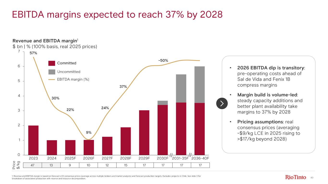 49 EBITDA margins expected to reach 37% by 2028 1. Revenue and EBITDA margin is based on forecast LCE consensus prices (average across multiple brokers and market analysts) and forecast production targets. Excludes projects in Chile. See slide 3 for breakdown of associated production with reserve and resource decomposition. Revenue and EBITDA margin 1 $ bn | % (100% basis, real 2025 prices) P ri ce $ /k g 47 13 9 10 12 15 17 17 17 17 0 1 2 3 4 5 6 7 57% 2023 30% 2024 22% 2025 F 9% 2026 F 24% 2027 F 37% 2028 F 2029 F 2030 F 2031 - 35 F 2036 - 40 F Uncommitted Committed EBITDA margin (%) • 2026 EBITDA dip is transitory : pre - operating costs ahead of Sal de Vida and Fenix 1B compress margins • Margin build is volume - led : steady capacity additions and better plant availability take margins to 37% by 2028 • Pricing assumptions : real consensus prices (averaging ~$9/kg LCE in 2025 rising to >$17/kg beyond 2028) ~50%