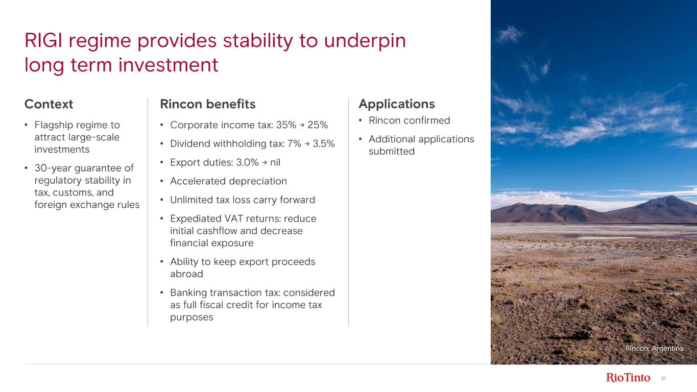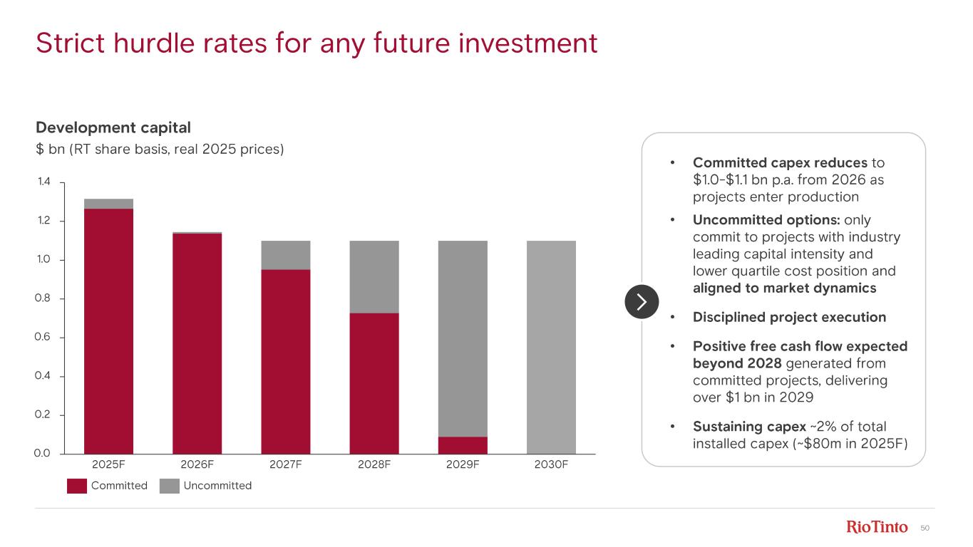 50 Strict hurdle rates for any future investment Development capital $ bn (RT share basis, real 2025 prices) 0.0 1.0 0.2 0.4 0.6 0.8 1.2 1.4 2025 F 2026 F 2027 F 2028 F 2029 F 2030 F UncommittedCommitted • Committed capex reduces to $1.0- $1.1 bn p.a. from 2026 as projects enter production • Uncommitted options: only commit to projects with industry leading capital intensity and lower quartile cost position and aligned to market dynamics • Disciplined project execution • Positive free cash flow expected beyond 2028 generated from committed projects, delivering over $1 bn in 2029 • Sustaining capex ~2% of total installed capex (~$80m in 2025F)