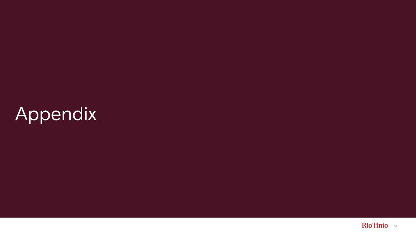 52 4 Creating value1 Operational excellence 2 Disciplined growth 3 Capital efficiency World - class integrated Lithium business and growth pipeline • +13% demand CAGR to 2035 • Proven DLE technology • Deep pipeline of growth options • Focus on capital intensity • Commit additional capital when supported by markets and returns 2026 production guidance Lithium: 61 - 64kt LCE (Rio Tinto share) Rincon, Argentina