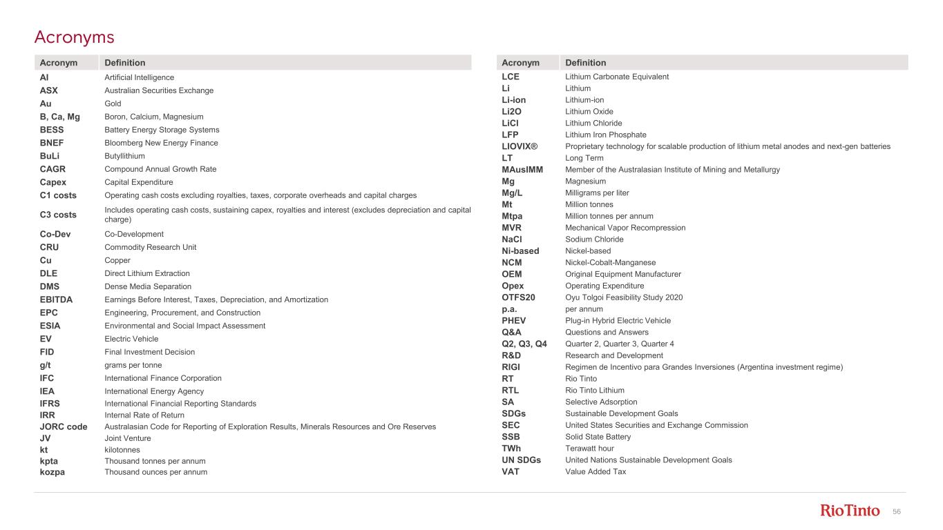 56 Acronym Definition LCE Lithium Carbonate Equivalent Li Lithium Li-ion Lithium-ion Li2O Lithium Oxide LiCl Lithium Chloride LFP Lithium Iron Phosphate LIOVIX® Proprietary technology for scalable production of lithium metal anodes and next-gen batteries LT Long Term MAusIMM Member of the Australasian Institute of Mining and Metallurgy Mg Magnesium Mg/L Milligrams per liter Mt Million tonnes Mtpa Million tonnes per annum MVR Mechanical Vapor Recompression NaCl Sodium Chloride Ni-based Nickel-based NCM Nickel-Cobalt-Manganese OEM Original Equipment Manufacturer Opex Operating Expenditure OTFS20 Oyu Tolgoi Feasibility Study 2020 p.a. per annum PHEV Plug-in Hybrid Electric Vehicle Q&A Questions and Answers Q2, Q3, Q4 Quarter 2, Quarter 3, Quarter 4 R&D Research and Development RIGI Regimen de Incentivo para Grandes Inversiones (Argentina investment regime) RT Rio Tinto RTL Rio Tinto Lithium SA Selective Adsorption SDGs Sustainable Development Goals SEC United States Securities and Exchange Commission SSB Solid State Battery TWh Terawatt hour UN SDGs United Nations Sustainable Development Goals VAT Value Added Tax Acronym Definition AI Artificial Intelligence ASX Australian Securities Exchange Au Gold B, Ca, Mg Boron, Calcium, Magnesium BESS Battery Energy Storage Systems BNEF Bloomberg New Energy Finance BuLi Butyllithium CAGR Compound Annual Growth Rate Capex Capital Expenditure C1 costs Operating cash costs excluding royalties, taxes, corporate overheads and capital charges C3 costs Includes operating cash costs, sustaining capex, royalties and interest (excludes depreciation and capital charge) Co-Dev Co-Development CRU Commodity Research Unit Cu Copper DLE Direct Lithium Extraction DMS Dense Media Separation EBITDA Earnings Before Interest, Taxes, Depreciation, and Amortization EPC Engineering, Procurement, and Construction ESIA Environmental and Social Impact Assessment EV Electric Vehicle FID Final Investment Decision g/t grams per tonne IFC International Finance Corporation IEA International Energy Agency IFRS International Financial Reporting Standards IRR Internal Rate of Return JORC code Australasian Code for Reporting of Exploration Results, Minerals Resources and Ore Reserves JV Joint Venture kt kilotonnes kpta Thousand tonnes per annum kozpa Thousand ounces per annum Acronyms