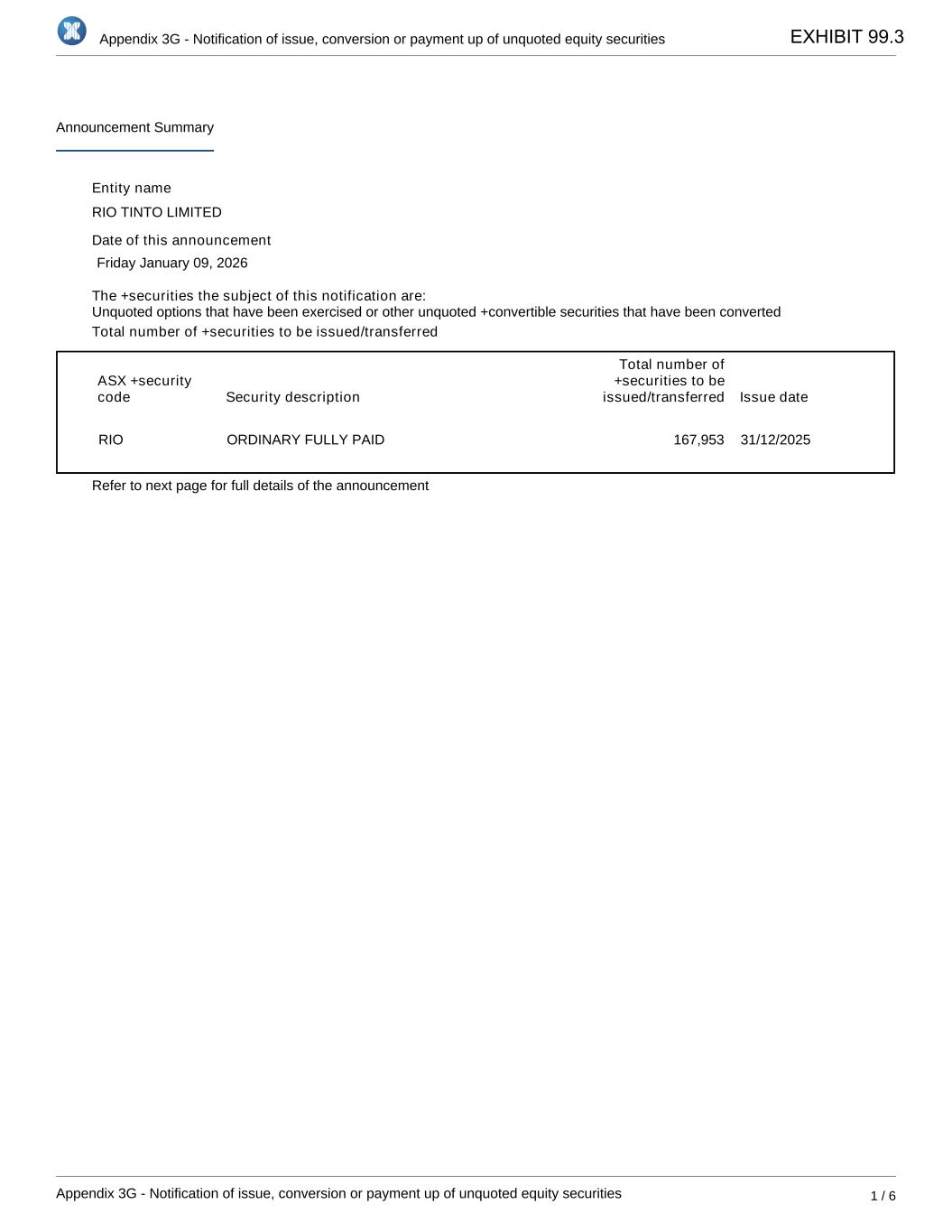 Appendix 3G - Notification of issue, conversion or payment up of unquoted equity securities Appendix 3G - Notification of issue, conversion or payment up of unquoted equity securities 1 / 6 Announcement Summary Entity name RIO TINTO LIMITED Date of this announcement Friday January 09, 2026 The +securities the subject of this notification are: Total number of +securities to be issued/transferred ASX +security code Security description Total number of +securities to be issued/transferred Issue date RIO ORDINARY FULLY PAID 167,953 31/12/2025 Refer to next page for full details of the announcement Unquoted options that have been exercised or other unquoted +convertible securities that have been converted EXHIBIT 99.3