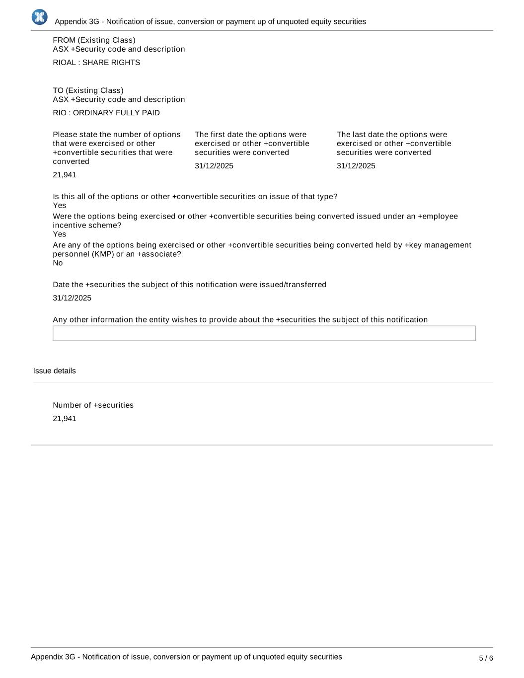 Appendix 3G - Notification of issue, conversion or payment up of unquoted equity securities Appendix 3G - Notification of issue, conversion or payment up of unquoted equity securities 4 / 6 Part 3B - number and type of +securities the subject of this notification (existing class) where issue has not previously been notified to ASX in an Appendix 3B The right of the holder of the options or other +convertible securities to receive the +underlying securities is being satisfied by: The underlying securities being received by the holder are: Existing +securities converting into an existing class FROM (Existing Class) ASX +Security code and description RIOAL : SHARE RIGHTS TO (Existing Class) ASX +Security code and description RIO : ORDINARY FULLY PAID Please state the number of options that were exercised or other +convertible securities that were converted 146,012 The first date the options were exercised or other +convertible securities were converted 31/12/2025 The last date the options were exercised or other +convertible securities were converted 31/12/2025 Is this all of the options or other +convertible securities on issue of that type? Were the options being exercised or other +convertible securities being converted issued under an +employee incentive scheme? Are any of the options being exercised or other +convertible securities being converted held by +key management personnel (KMP) or an +associate? Date the +securities the subject of this notification were issued/transferred 31/12/2025 Any other information the entity wishes to provide about the +securities the subject of this notification Issue details Number of +securities 146,012 The right of the holder of the options or other +convertible securities to receive the +underlying securities is being satisfied by: The underlying securities being received by the holder are: Existing +securities converting into an existing class FROM (Existing Class) Already quoted by ASX A transfer of existing +securities No Yes Yes Already quoted by ASX A transfer of existing +securities