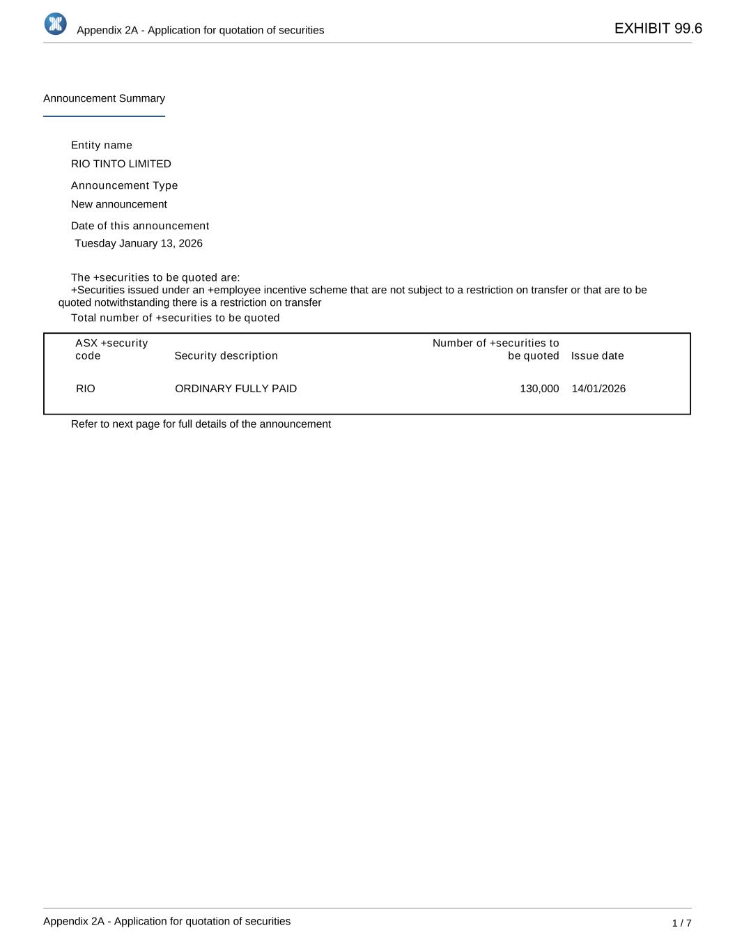 Appendix 2A - Application for quotation of securities Appendix 2A - Application for quotation of securities 1 / 7 Announcement Summary Entity name RIO TINTO LIMITED Announcement Type New announcement Date of this announcement Tuesday January 13, 2026 The +securities to be quoted are: Total number of +securities to be quoted ASX +security code Security description Number of +securities to be quoted Issue date RIO ORDINARY FULLY PAID 130,000 14/01/2026 Refer to next page for full details of the announcement +Securities issued under an +employee incentive scheme that are not subject to a restriction on transfer or that are to be quoted notwithstanding there is a restriction on transfer EXHIBIT 99.6