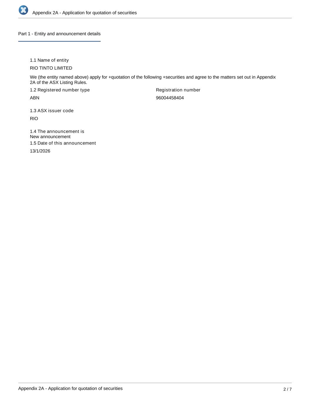 Appendix 2A - Application for quotation of securities Appendix 2A - Application for quotation of securities 2 / 7 Part 1 - Entity and announcement details 1.1 Name of entity RIO TINTO LIMITED We (the entity named above) apply for +quotation of the following +securities and agree to the matters set out in Appendix 2A of the ASX Listing Rules. 1.2 Registered number type ABN Registration number 96004458404 1.3 ASX issuer code RIO 1.4 The announcement is 1.5 Date of this announcement 13/1/2026 New announcement