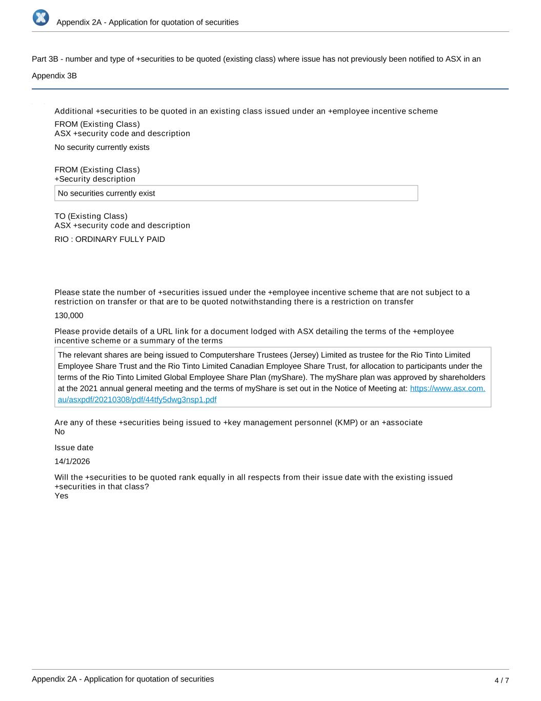 Appendix 2A - Application for quotation of securities Appendix 2A - Application for quotation of securities 4 / 7 Part 3B - number and type of +securities to be quoted (existing class) where issue has not previously been notified to ASX in an Appendix 3B Additional +securities to be quoted in an existing class issued under an +employee incentive scheme FROM (Existing Class) ASX +security code and description No security currently exists FROM (Existing Class) +Security description No securities currently exist TO (Existing Class) ASX +security code and description RIO : ORDINARY FULLY PAID Please state the number of +securities issued under the +employee incentive scheme that are not subject to a restriction on transfer or that are to be quoted notwithstanding there is a restriction on transfer 130,000 Please provide details of a URL link for a document lodged with ASX detailing the terms of the +employee incentive scheme or a summary of the terms The relevant shares are being issued to Computershare Trustees (Jersey) Limited as trustee for the Rio Tinto Limited Employee Share Trust and the Rio Tinto Limited Canadian Employee Share Trust, for allocation to participants under the terms of the Rio Tinto Limited Global Employee Share Plan (myShare). The myShare plan was approved by shareholders at the 2021 annual general meeting and the terms of myShare is set out in the Notice of Meeting at: https://www.asx.com. au/asxpdf/20210308/pdf/44tfy5dwg3nsp1.pdf Are any of these +securities being issued to +key management personnel (KMP) or an +associate Issue date 14/1/2026 Will the +securities to be quoted rank equally in all respects from their issue date with the existing issued +securities in that class? Yes No