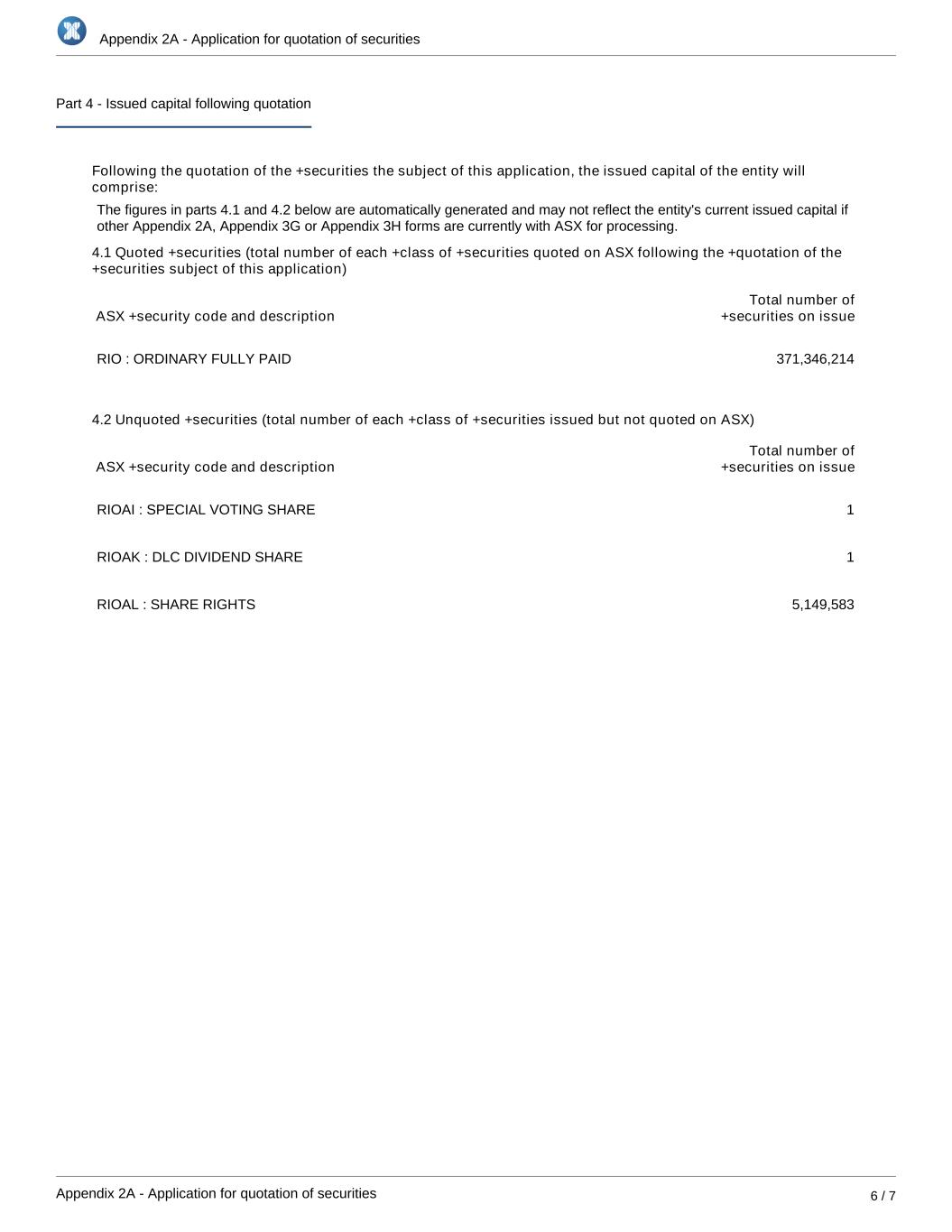 Appendix 2A - Application for quotation of securities Appendix 2A - Application for quotation of securities 6 / 7 Part 4 - Issued capital following quotation Following the quotation of the +securities the subject of this application, the issued capital of the entity will comprise: The figures in parts 4.1 and 4.2 below are automatically generated and may not reflect the entity's current issued capital if other Appendix 2A, Appendix 3G or Appendix 3H forms are currently with ASX for processing. 4.1 Quoted +securities (total number of each +class of +securities quoted on ASX following the +quotation of the +securities subject of this application) ASX +security code and description Total number of +securities on issue RIO : ORDINARY FULLY PAID 371,346,214 4.2 Unquoted +securities (total number of each +class of +securities issued but not quoted on ASX) ASX +security code and description Total number of +securities on issue RIOAI : SPECIAL VOTING SHARE 1 RIOAK : DLC DIVIDEND SHARE 1 RIOAL : SHARE RIGHTS 5,149,583