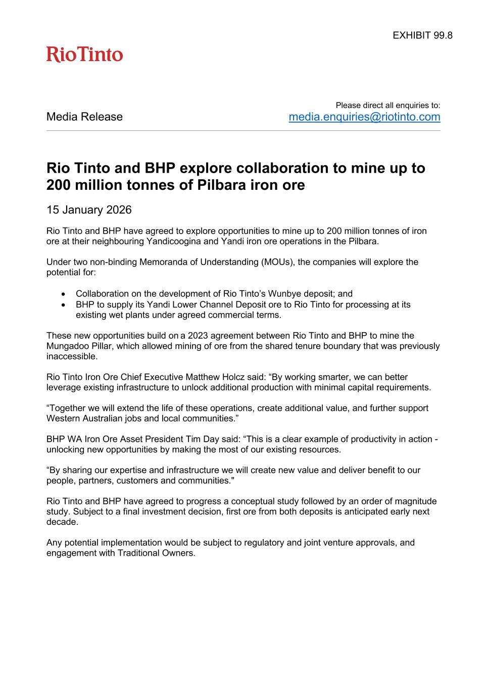 Please direct all enquiries to: Media Release media.enquiries@riotinto.com Rio Tinto and BHP explore collaboration to mine up to 200 million tonnes of Pilbara iron ore 15 January 2026 Rio Tinto and BHP have agreed to explore opportunities to mine up to 200 million tonnes of iron ore at their neighbouring Yandicoogina and Yandi iron ore operations in the Pilbara. Under two non-binding Memoranda of Understanding (MOUs), the companies will explore the potential for: • Collaboration on the development of Rio Tinto’s Wunbye deposit; and • BHP to supply its Yandi Lower Channel Deposit ore to Rio Tinto for processing at its existing wet plants under agreed commercial terms. These new opportunities build on a 2023 agreement between Rio Tinto and BHP to mine the Mungadoo Pillar, which allowed mining of ore from the shared tenure boundary that was previously inaccessible. Rio Tinto Iron Ore Chief Executive Matthew Holcz said: “By working smarter, we can better leverage existing infrastructure to unlock additional production with minimal capital requirements. “Together we will extend the life of these operations, create additional value, and further support Western Australian jobs and local communities.” BHP WA Iron Ore Asset President Tim Day said: “This is a clear example of productivity in action - unlocking new opportunities by making the most of our existing resources. “By sharing our expertise and infrastructure we will create new value and deliver benefit to our people, partners, customers and communities." Rio Tinto and BHP have agreed to progress a conceptual study followed by an order of magnitude study. Subject to a final investment decision, first ore from both deposits is anticipated early next decade. Any potential implementation would be subject to regulatory and joint venture approvals, and engagement with Traditional Owners. EXHIBIT 99.8
